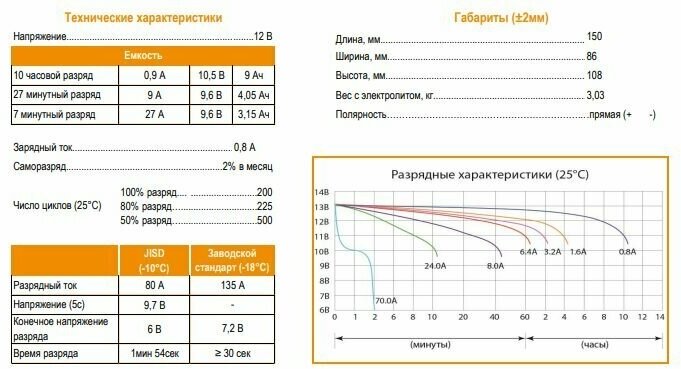 | Стандартная ёмкость при токе 10-часового разряда | 9 Ач |
