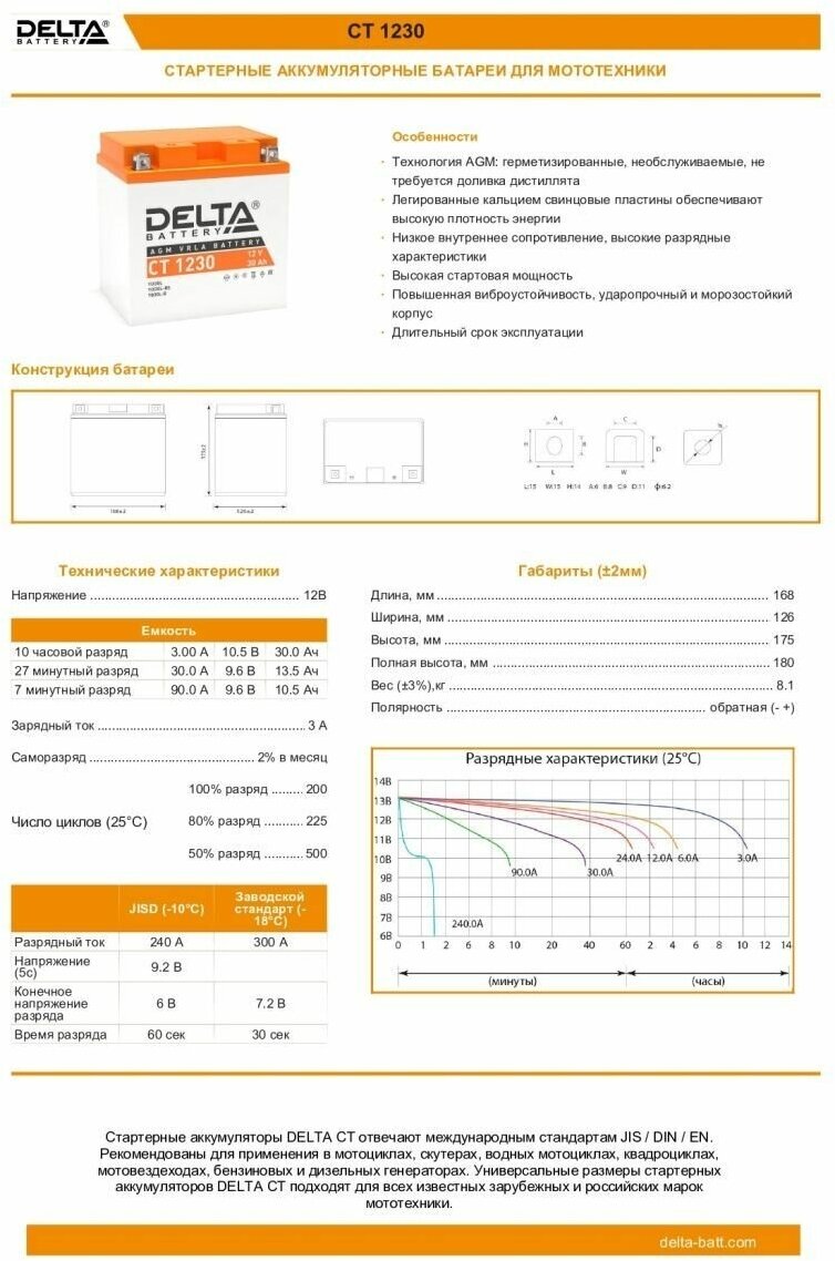 | Стандартная ёмкость при токе 10-часового разряда | 30 Ач |