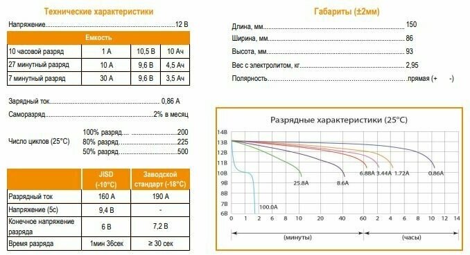 | Стандартная ёмкость при токе 10-часового разряда | 10 Ач |