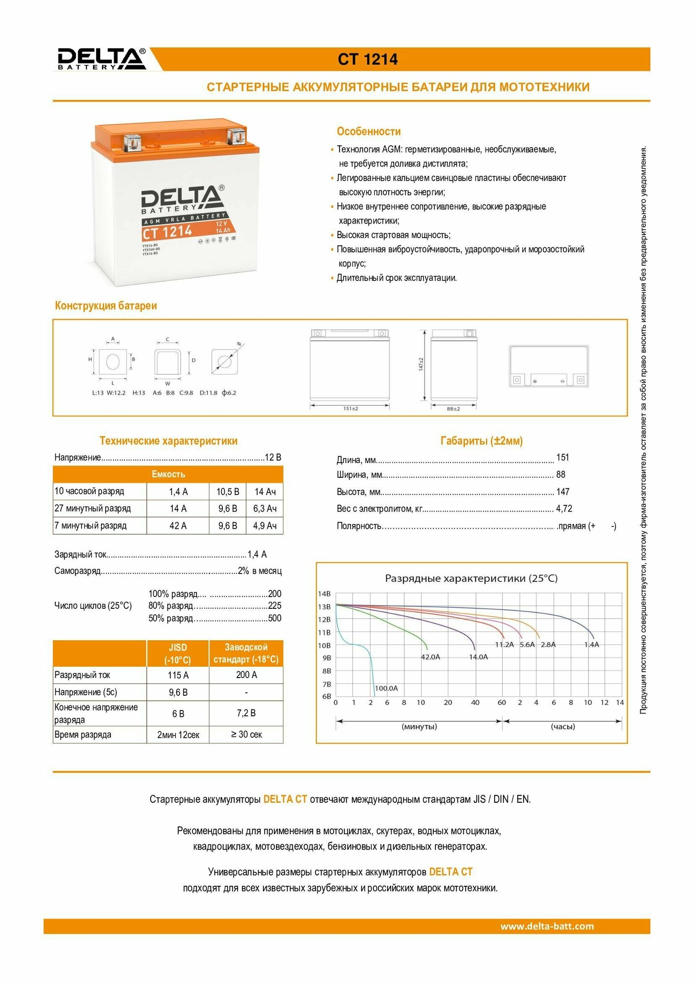 | Стандартная ёмкость при токе 10-часового разряда | 14 Ач |