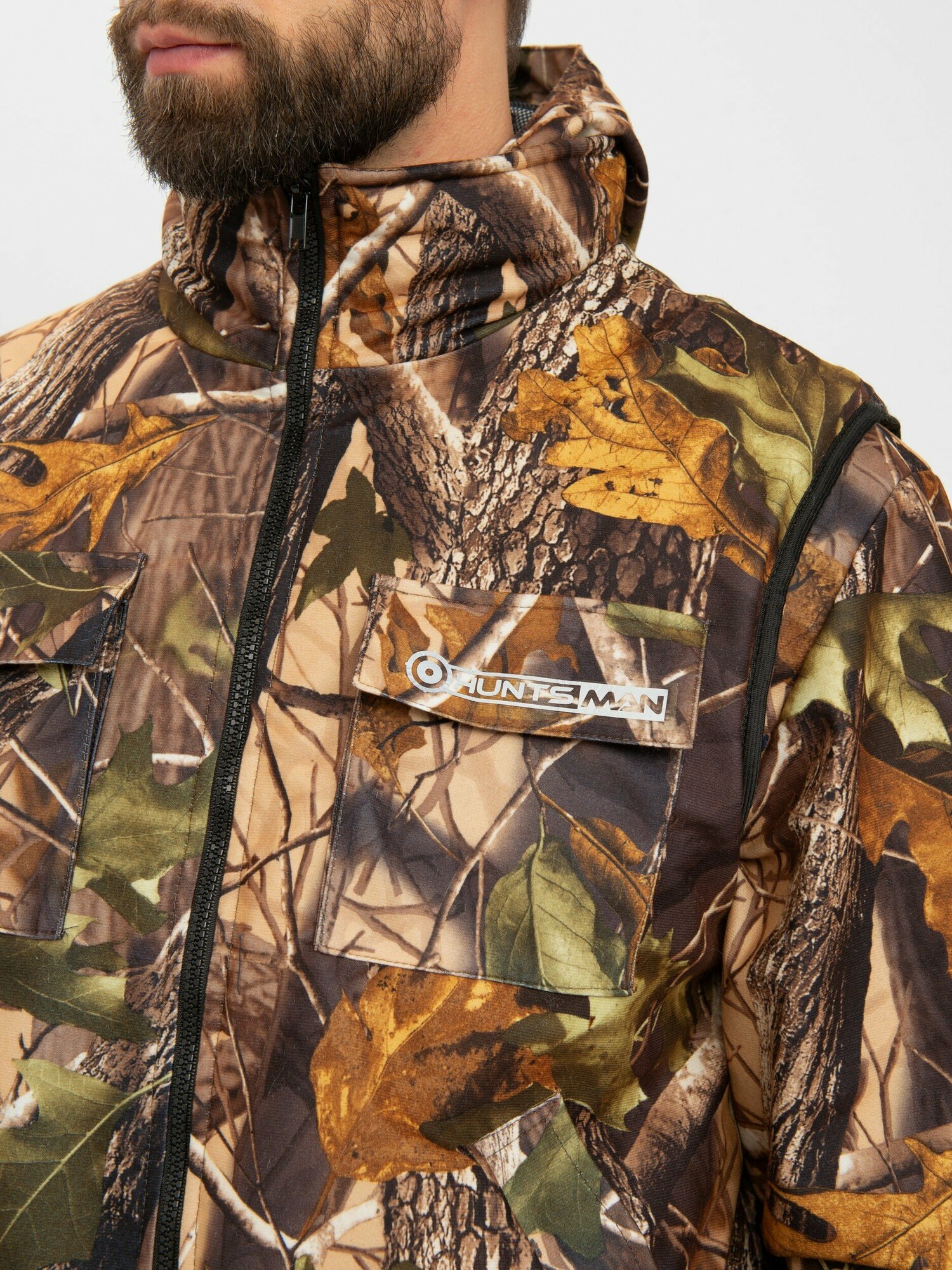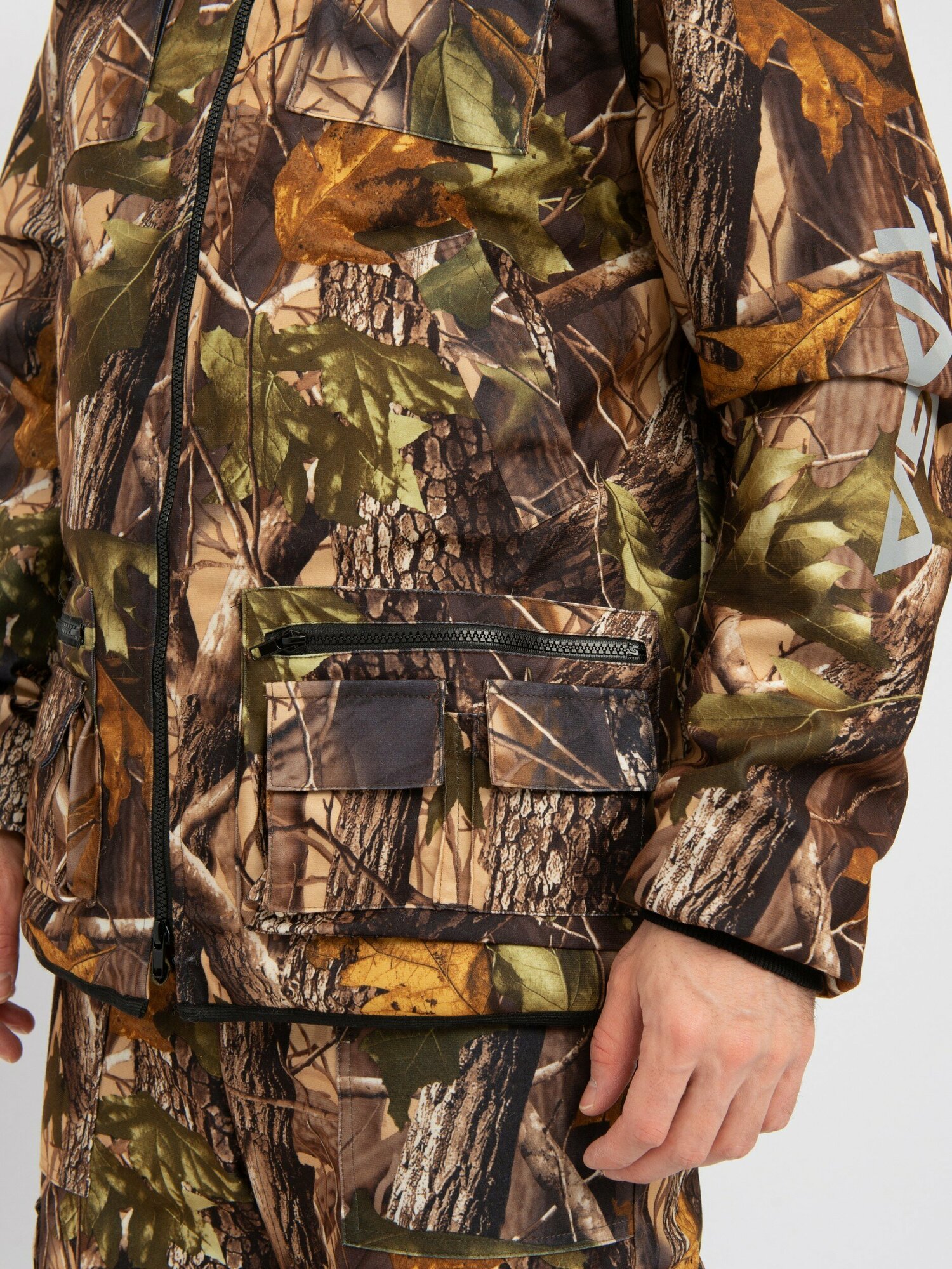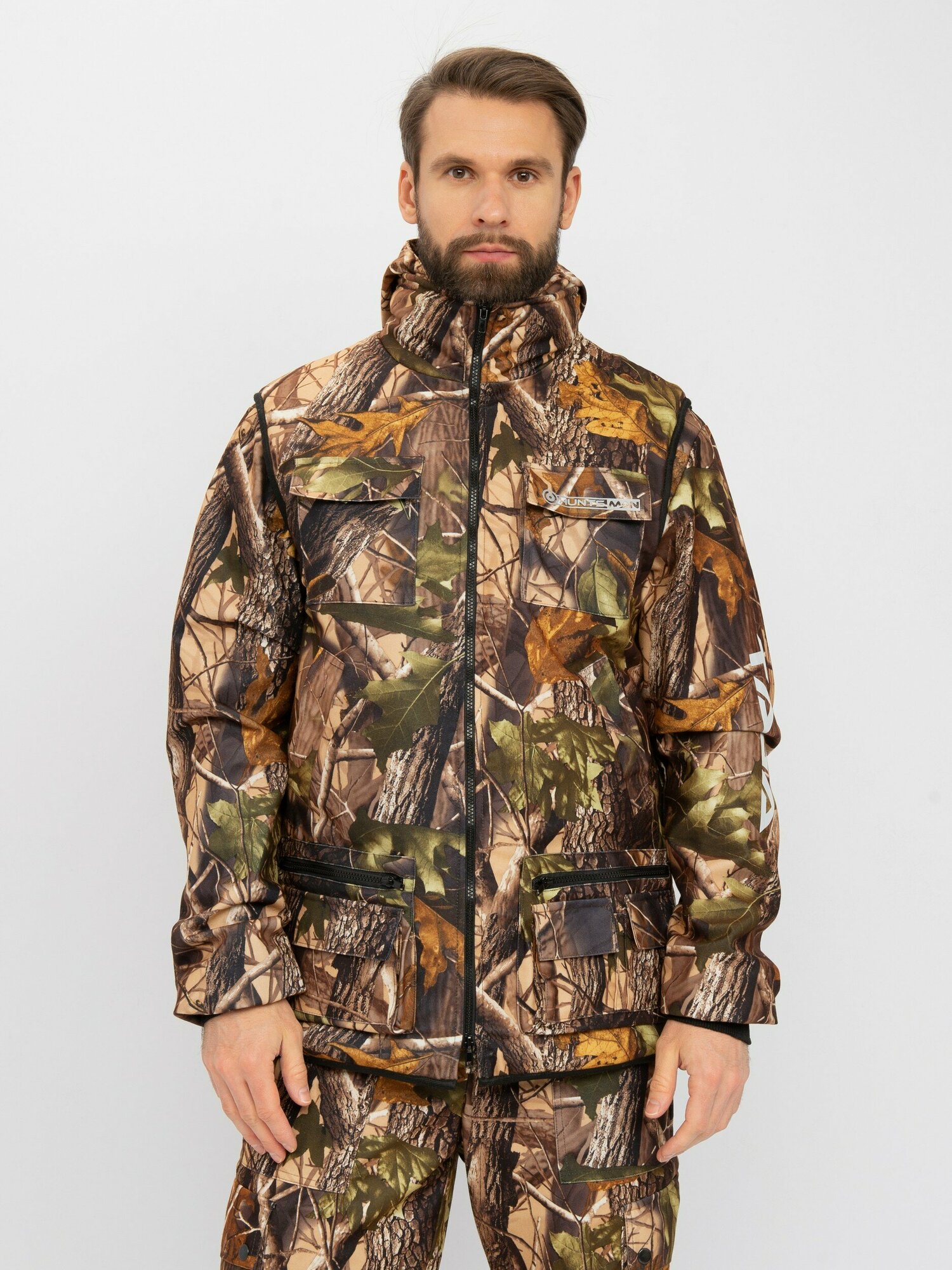 Универсальный разгрузочный костюм для теплой и прохладной погоды. Костюм тройка. Состоит из куртки, брюк, утепленного жилета. Утеплённый разгрузочный жилет защитит в холодную погоду. Камуфляжная расцветка с маскировочным эффектом. Особенности:притачной капюшонкуртка с объёмными карманами на груди и боковыми карманамиэластичные манжеты из рибаныбрюки с застёжкой гульфика на пуговицыжилет на молнии с воротником «стойка»на жилете один внутренний карман, два нагрудных, два боковых, два кармана внизу на замкедополнительный объем брючин в области коленадва накладных кармана на брюкахутеплитель жилета Radotex 150 гр/кв. мвнутри костюм на подкладке