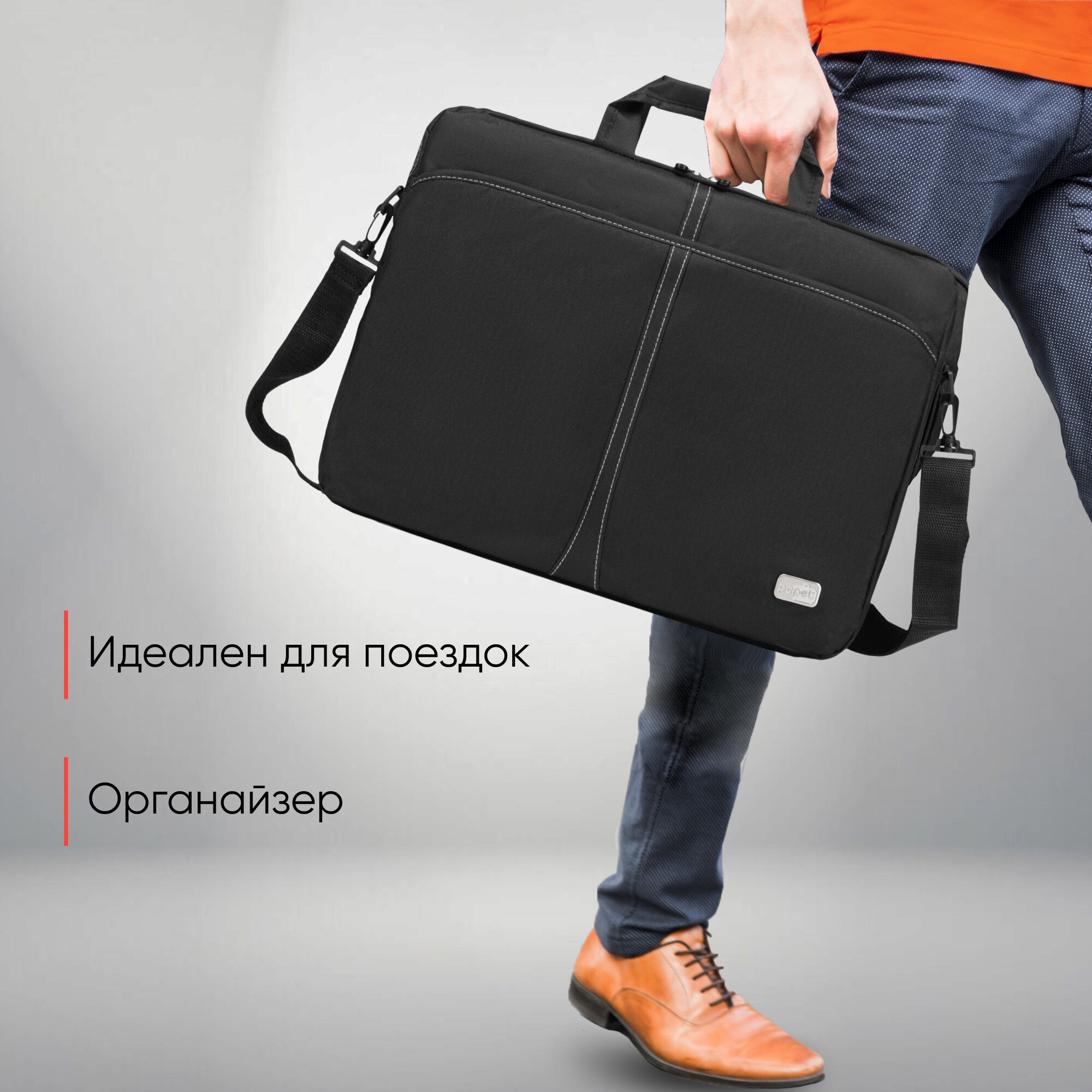 Сумка PC PET PCP-A1117 обеспечивает высокий уровень защиты ноутбука и других электронных гаджетов. Ее мягкая подкладка из вспененного материала эффективно поглощает ударные нагрузки – в том числе возникающие при падениях. Большая вместимость. В основном отделении найдется место не только для портативного компьютера, но и для документов, а также для других небольших предметов. Дополнительный карман в передней части отлично подходит для хранения зарядного устройства, внешнего винчестера, портативной батареи, мышки и других гаджетов.Качественный материал. Аксессуар создан из плотной ткани на основе нейлона. Она выдерживает большие нагрузки без разрывов, не пропускает воду и не впитывает грязь.Универсальное применение. В комплект поставки входит длинный наплечный ремень, позволяющий брать сумку с собой в длительные поездки.