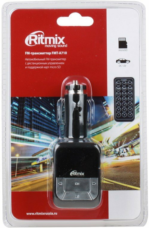 Ritmix – это FM-трансмиттер (FM-модулятор) с функцией mp3-плеера, позволяющий передавать аудиосигнал на автомобильную стереосистему с любого устройства, поддерживающего стандарт USB. Бюджетная модель, при этом она имеет MicroSD-слот для воспроизведения mp3-файлов напрямую с карты, без переходников. Также воспроизведение возможно и с USB-флэшек. В комплекте идёт пульт дистанционного управления.