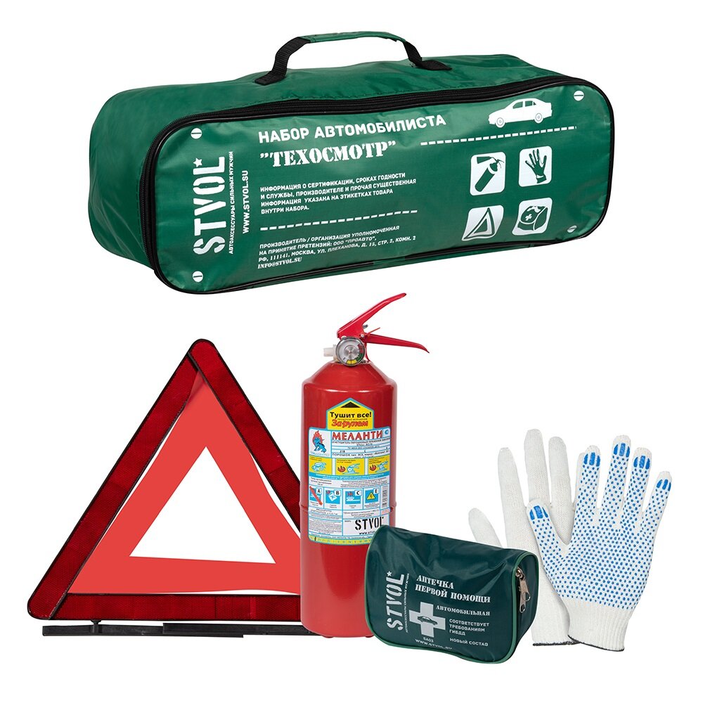 | Состав набора | аптечка; знак аварийной остановки; огнетушитель; перчатки |