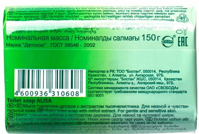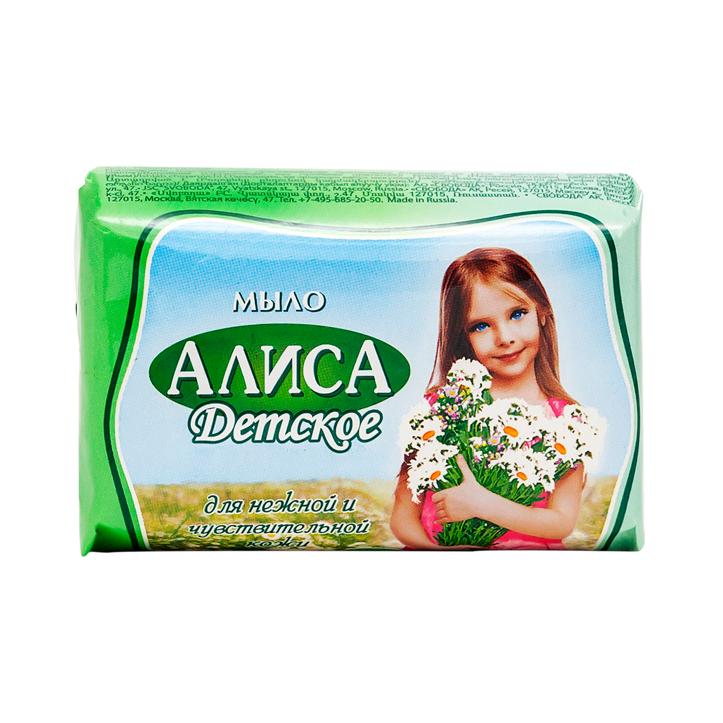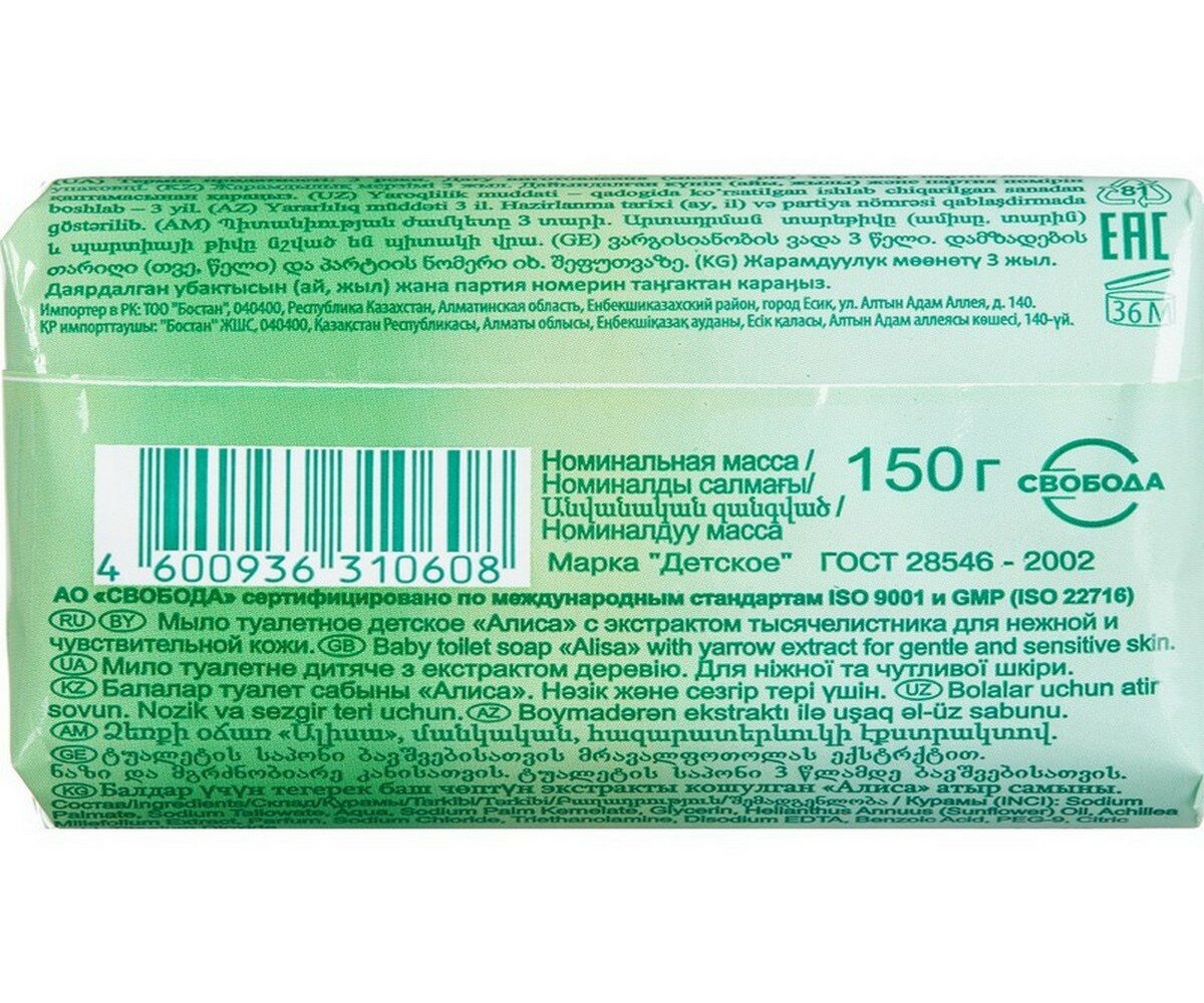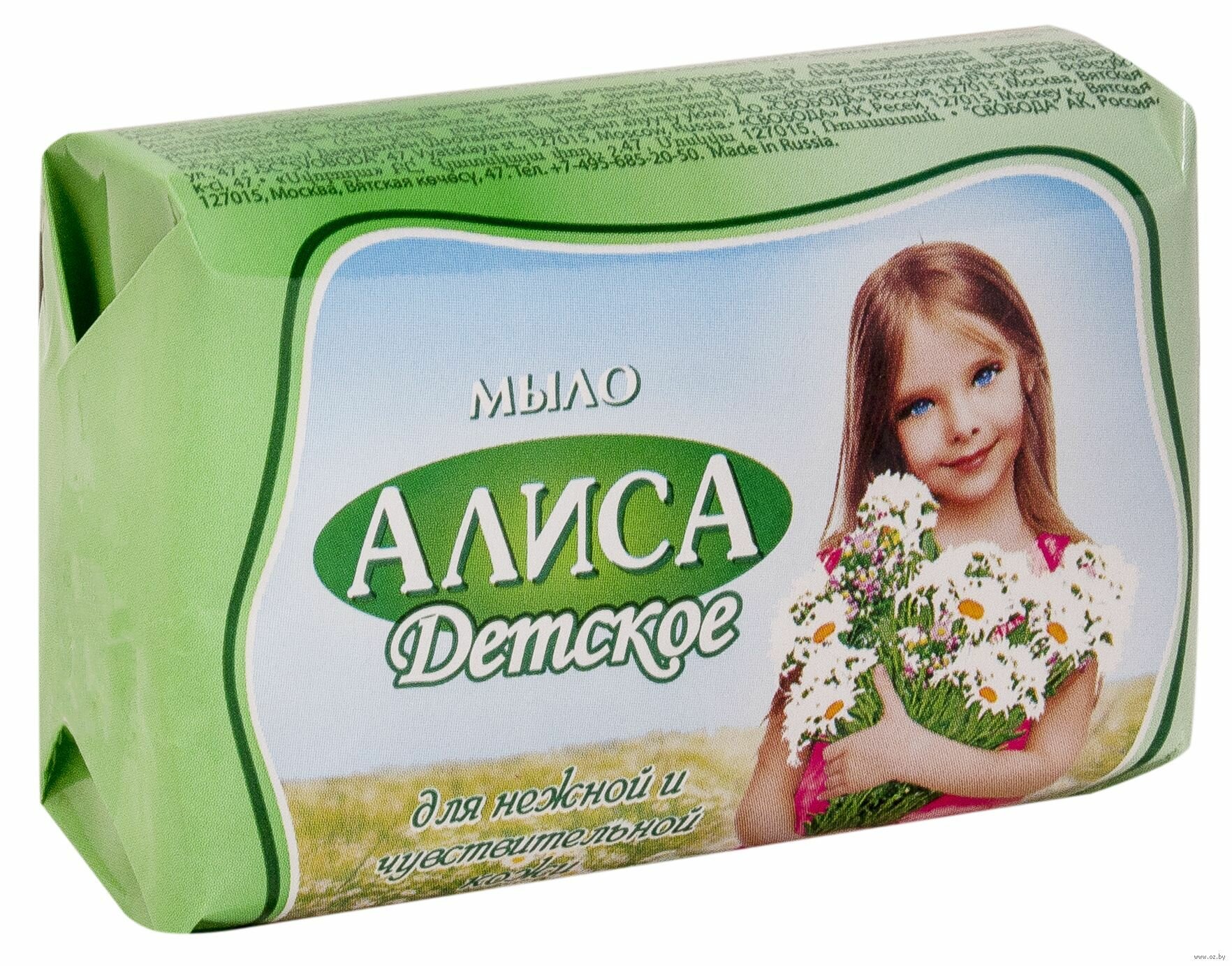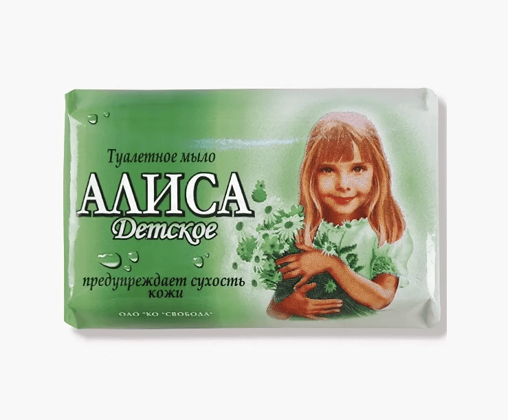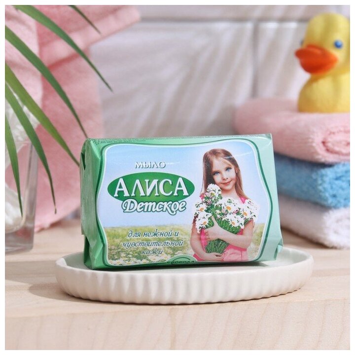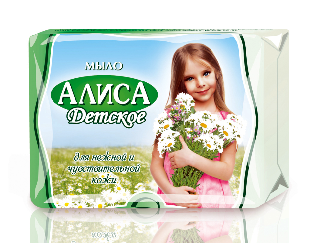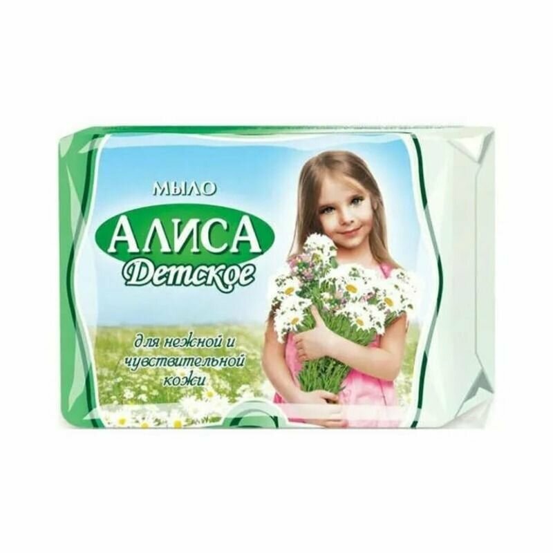 Детское туалетное мыло «Алиса». Содержит экстракт тысячелистника и натуральный глицерин, которые оказывают противовоспалительное действие, бережно очищают и увлажняют кожу. Детское мыло (кусковое) изготовлено без использования красителей и агрессивных моющих веществ.