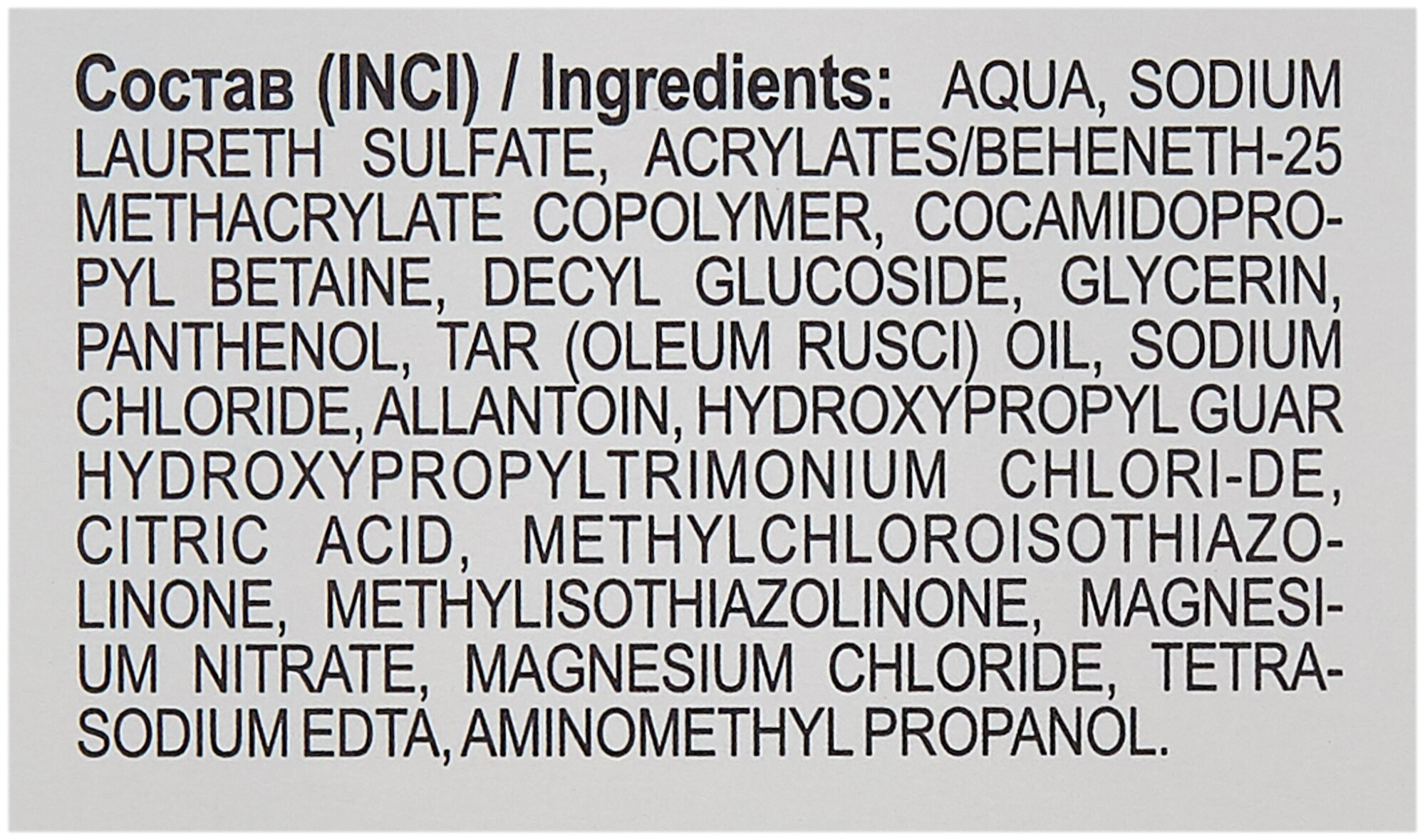 Состав: Вода деминерализованная, лауретсульфат натрия, акриловый сополимер, кокамидопропил-бетаин, децилглюкозид, глицерин, Д-пантенол, деготь березовый, натрия хлорид, аллантоин, гидроксипропил гуар идроксипропилтримониум хлорид, лимонная кислота, метилхлоризотиазолинон и метилизотиазолинон, трилон Б, натрия гидроокись.
