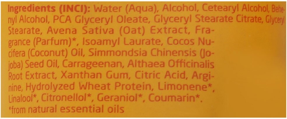 Композиция ценнейших растительных ингредиентов, включающая органические оливковое и кокосовые масла, экстракт овса и белой мальвы, разглаживает поверхность волос и облегчает лёгкое расчёсывание, придаёт эластичность, упругость и блеск, увлажняет волосы и возвращает их природную силу. Не содержит силиконов, минеральных масел, моющих веществ на основе сульфатов, синтетических ароматизаторов и консервантов. Данный товар имеет маркировку ЭКО.