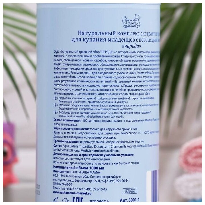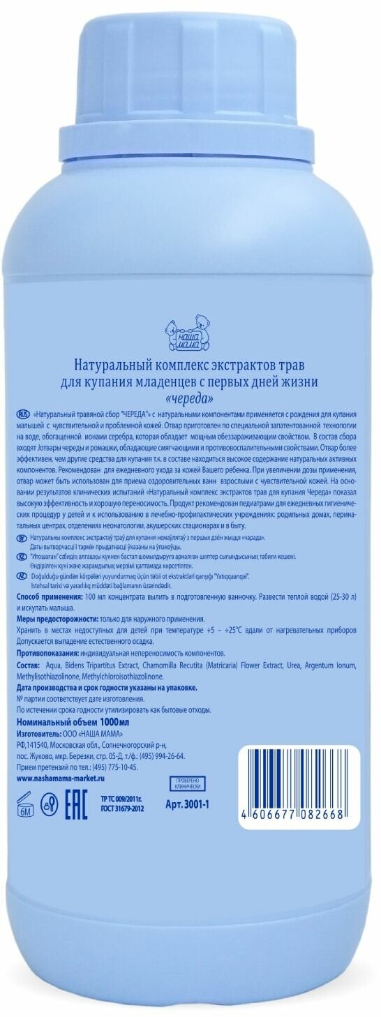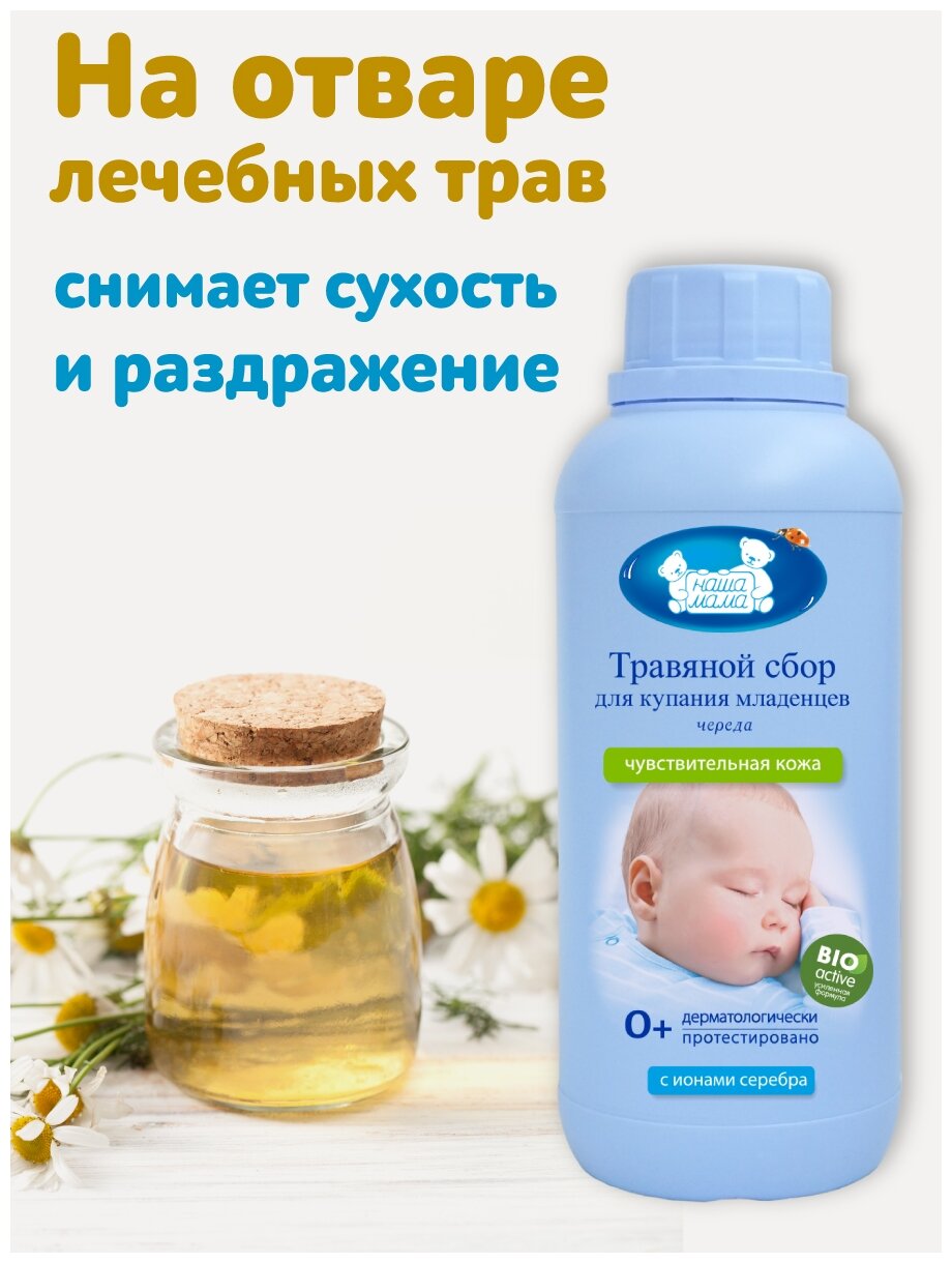 Увлажняет, успокаивает и оказывает противоспалительное действие на нежную кожу малыша, борется с опрелостями. Высокое содержание активных компонентов и комплексный состав обеспечивают высокую эффективность средства, а ионы серебра являются мощным обеззараживающим барьером и ускоряют процесс регенерации. Вода, использовавшаяся при изготовлении комплекса экстрактов трав для купания Наша мама Череда, прошла специальную очистку. 1 флакон рассчитан на 10 купаний малыша.