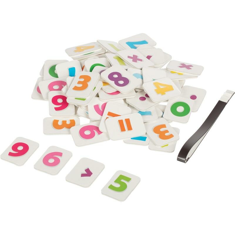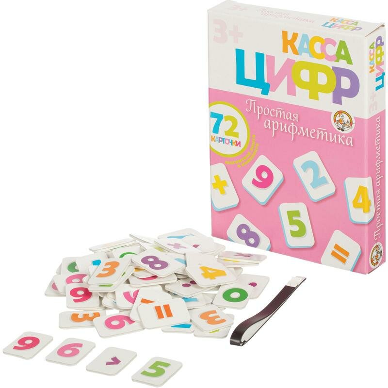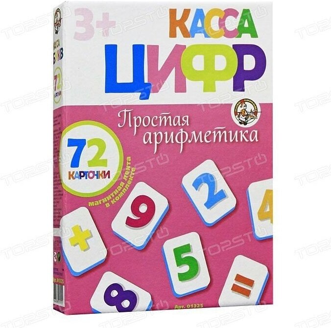 Касса цифр Простая арифметика является вспомогательным материалом, рассчитанным на родителей, педагогов и воспитателей для обучения ребенка счету. Данный набор постепенно, шаг за шагом, поможет Вашему ребенку познакомиться с цифрами, запомнить их написание, освоить математические понятия, научиться считать и производить простейшие арифметические действия (сложение, вычитание, деление и умножение). Касса цифр на магнитах Простая арифметика состоит из 72 мягких карточек с изображением цифр и математических знаков, размером 3,5 на 5 сантиметров. Для использования карточек в качестве магнитного материала в наборе предусмотрена магнитная лета с односторонним клейким слоем, которая нарезается кусочками 5-6 мм. Каждый кусочек наклеивается по центру обратной стороны карточки. Оставшуюся магнитную ленту используйте, как ремкомплет. Готовые карточки хорошо фиксируются на любой металлической поверхности.