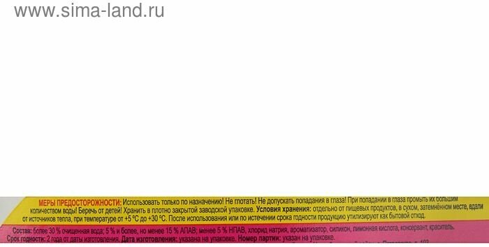 | Состав | более 30% очищенная вода, 5% и более, но менее 15% АПАВ, менее 5% НПАВ, хлорид натрия, ароматизатор, силикон, лимонная кислота, консервант, краситель. |