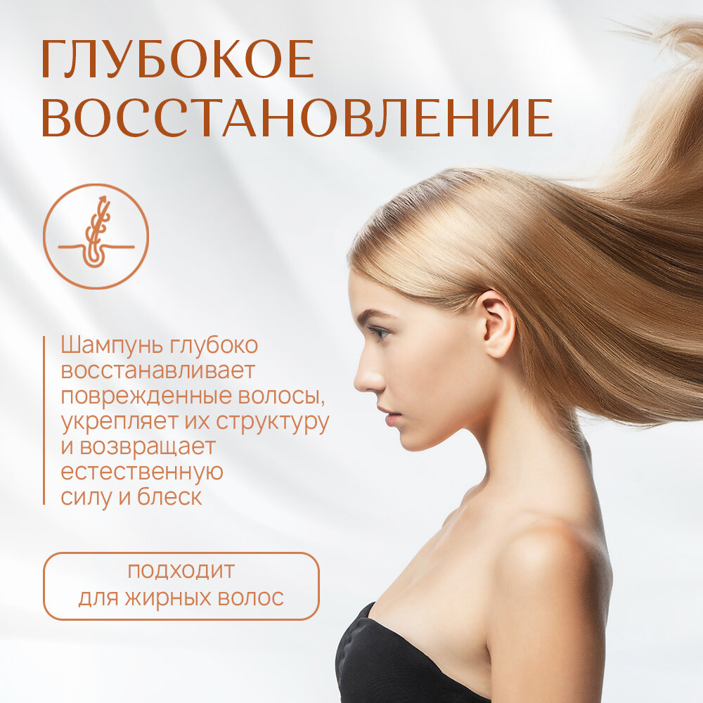 Восстанавливающий питательный шампунь с протеинами шелка и комплексом растительных экстрактов для поврежденных волос. Также, хорошо подходит и для жирных волос. Он прекрасно восстанавливает, питает и наполняет волосы энергией. Они становятся здоровыми, сильными и блестящими. В состав средства входят эффективные действенные компоненты, которые издревле используются на Востоке для поддержания красоты и здоровья волос ? шелк и растительные экстракты хризантемы, бамбука, камелии и полыни. В состав шампуня входит масло «Золотой Шелк» и протеин Cерицин, который по своему строению близок к кератину волос и включает в себя полный комплекс аминокислот. Они интенсивно питают поврежденные волосы, выравнивают и восстанавливают структуру волос, «цементируя» поврежденное пространство и надежно защищая волосы от ломкости и предупреждая появление секущихся кончиков.