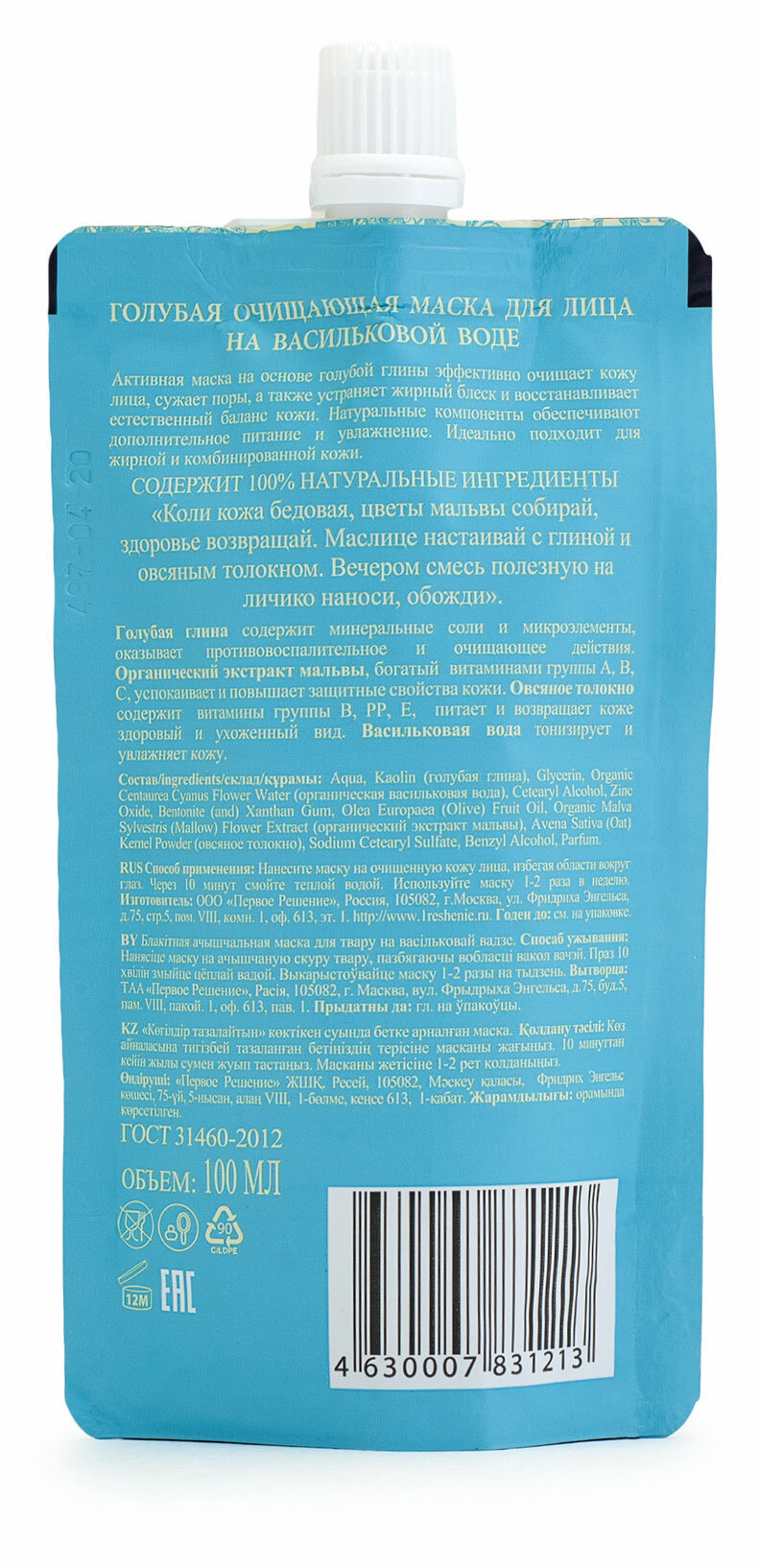 В качестве основы для этой активной маски применяется голубая глина, которая способствует максимально эффективному очищению кожной поверхности лица, а также хорошо сужает поры, избавляет от жирного блеска и помогает восстановить естественный баланс кожи. Вместе с другими натуральными компонентами она обеспечивает дополнительное увлажнение и питание кожи. Данное средство просто идеально подходит для комбинированной и жирной кожи. Благодаря голубой глине, насыщенной минеральными солями и микроэлементами, маска оказывает на кожу превосходное очищающее и противовоспалительное действия, тогда как органический экстракт мальвы, обогащенный витаминами A, C и группы B, отлично успокаивает и укрепляет защитные функции кожного покрова. Присутствие в составе овсяного толокна, содержащего витамины E, PP и группы B, способствует насыщению кожи питательными веществами, возвращает ей здоровый и ухоженный вид. За счет содержания васильковой воды кожа превосходно увлажняется и тонизируется.