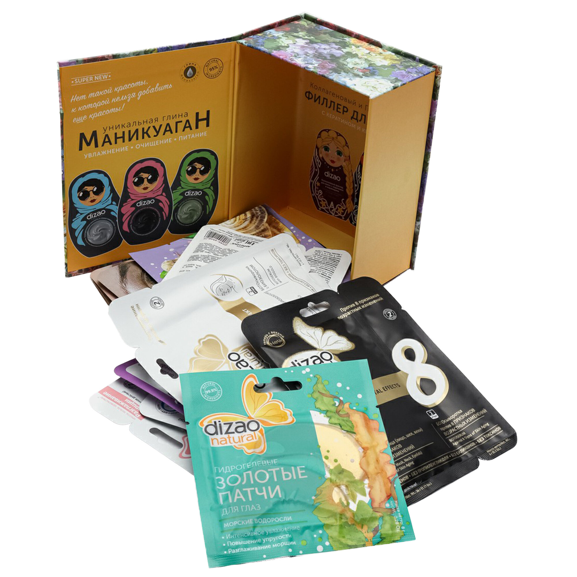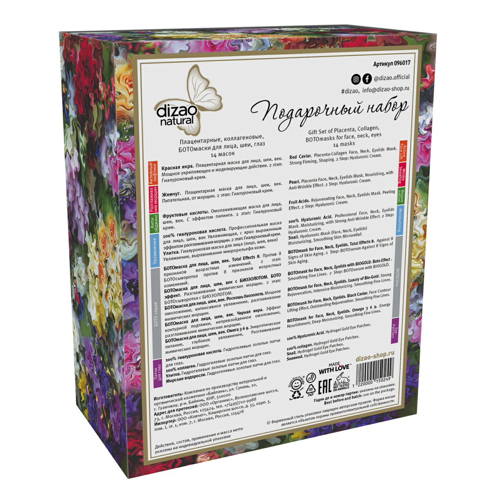 | Состав набора | маска для лица, шеи и век dizao 100% коллаген - 1 шт; маска для лица, шеи и век dizao жемчуг - 1 шт; маска для лица, шеи и век dizao фруктовые кислоты - 1 шт; маска для лица, шеи и век dizao 100% гиалуроновая кислота - 1 шт; гиалуроновая маска для лица, шеи и век dizao улитка - 1 шт; бото маска для лица и шеи dizao бото 8 признаков - 1 шт; бото маска для лица, шеи и век dizao с гиалуроновым заполнителем морщин - 1 шт; бото маска для глаз dizao с гиалуроновым заполнителем морщин - 1 шт; бото маска для лица, шеи и век dizao роскошь биозолота - 1 шт; бото маска для лица, шеи и век dizao черная икра - 1 шт; бото маска для лица, шеи и век dizao омега 3 6 9 - 1 шт; гидрогелевые золотые патчи для глаз dizao 100% гиалуроновая кислота - 1 шт; гидрогелевые золотые патчи для глаз dizao 100% коллаген - 1 шт; гидрогелевые золотые патчи для глаз dizao улитка - 1 шт |