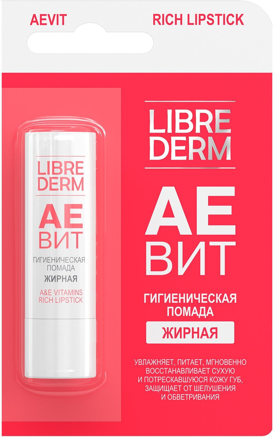 | Полное наименование | Librederm Аевит гигиеническая губная помада жирная 4 г |