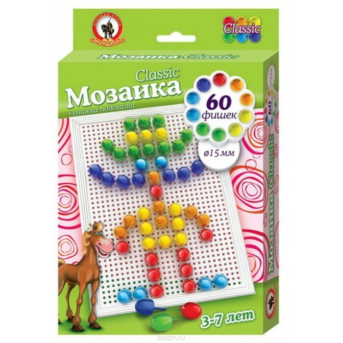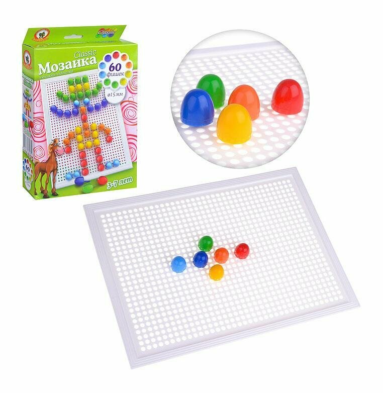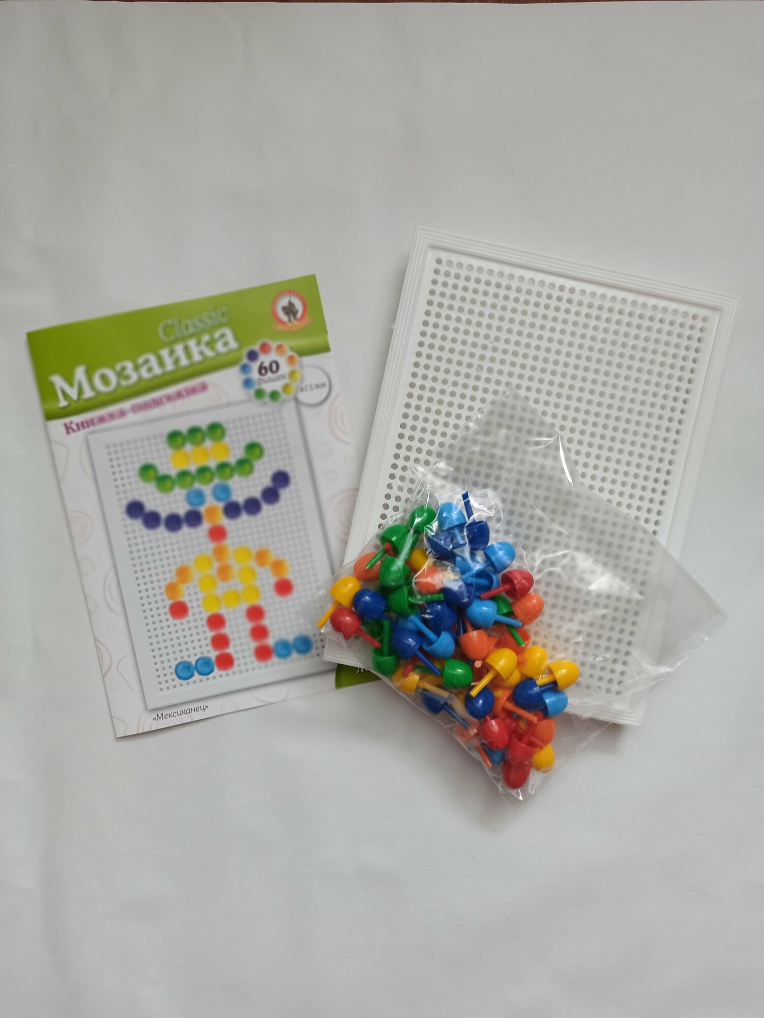 Классическая мозаика «Мексиканец» выполнена из качественного прочного пластика. Игра укомплектована разноцветными фишками, позволяющими создавать яркие картинки на поверхности специальной доски с отверстиями. Помимо этого в комплекте поставляется книжка с готовыми вариантами картинок, помогающими ребенку развить зрительную память и внимательность при переносе изображения на плату. Благодаря системе закрепления фишек, при переворачивании детали не выпадают и остаются в местах крепления. Удобный диаметр фишек (15 мм) обеспечивает ребенку возможность дополнительно формировать навык трехпальцевого захвата, необходимого в дальнейшем при письме. Мозаика предназначена для развития логического мышления, ориентации на плоскости, цветовосприятия.