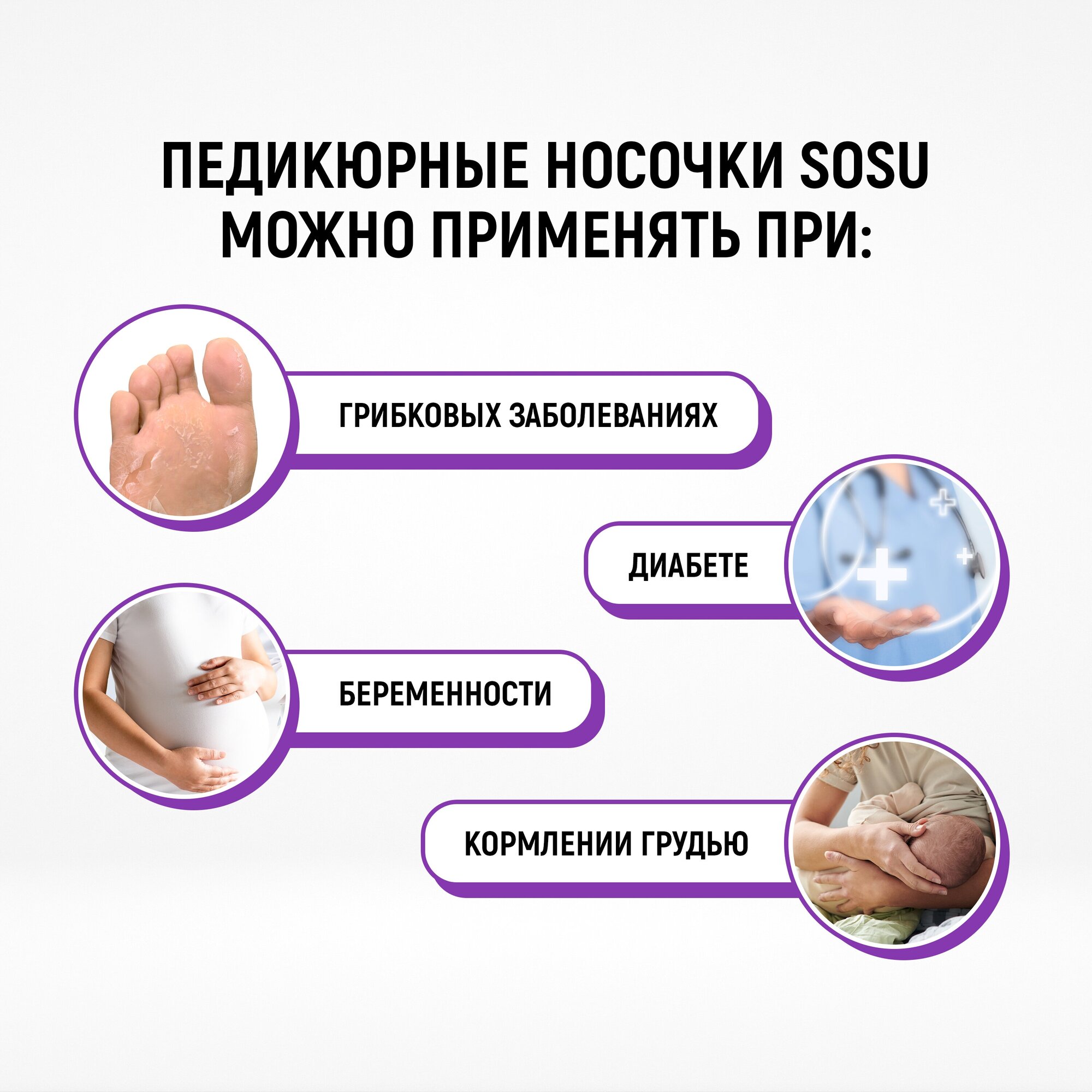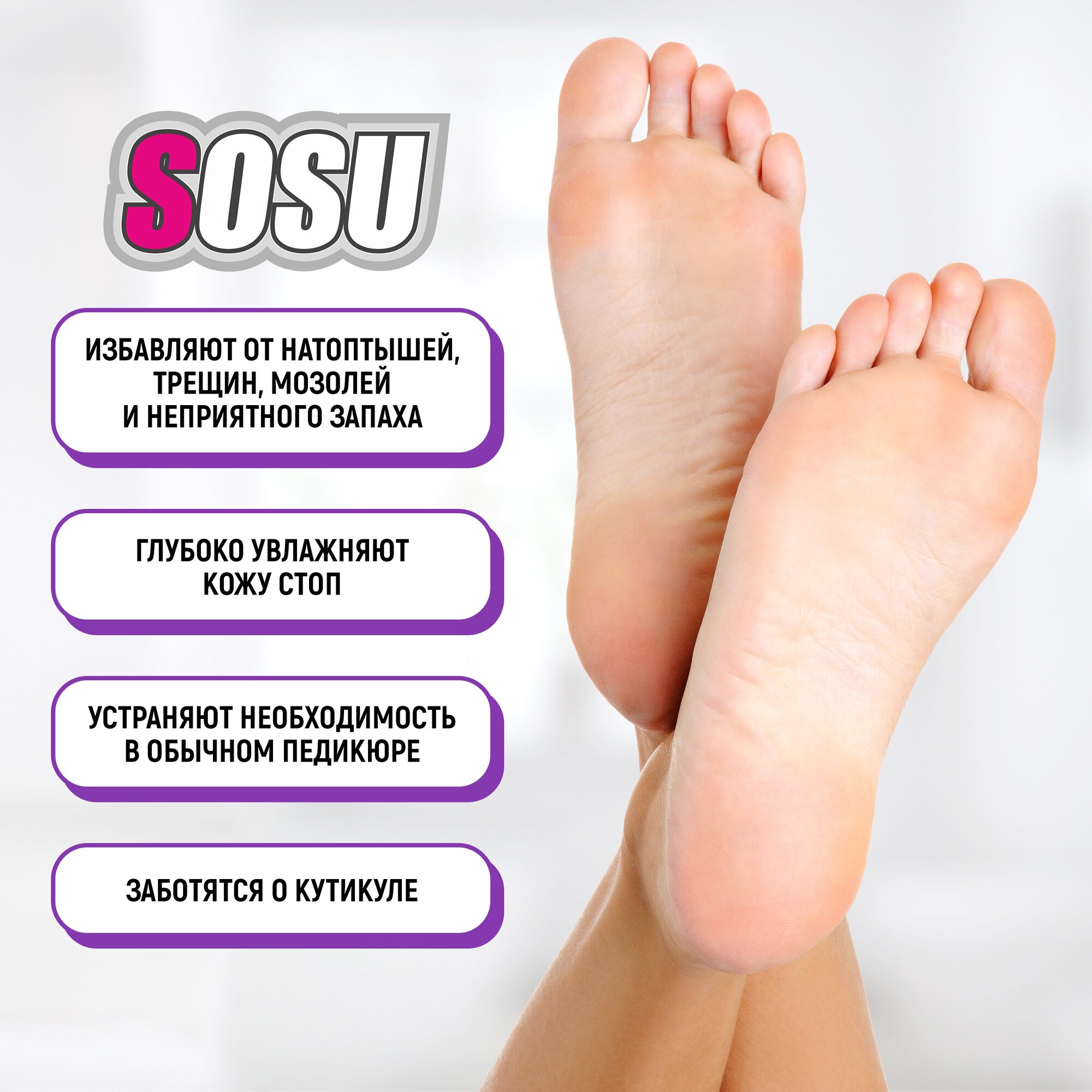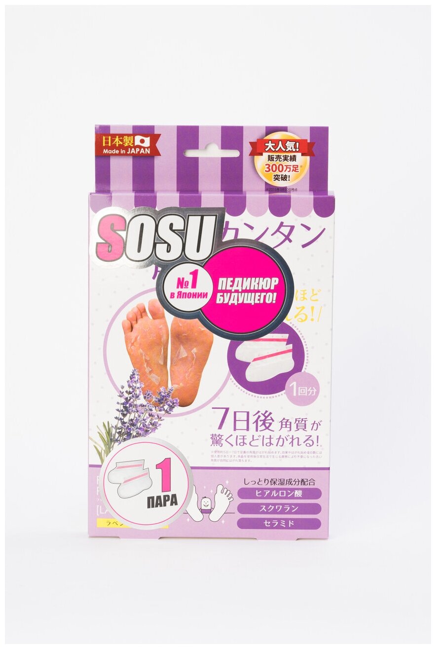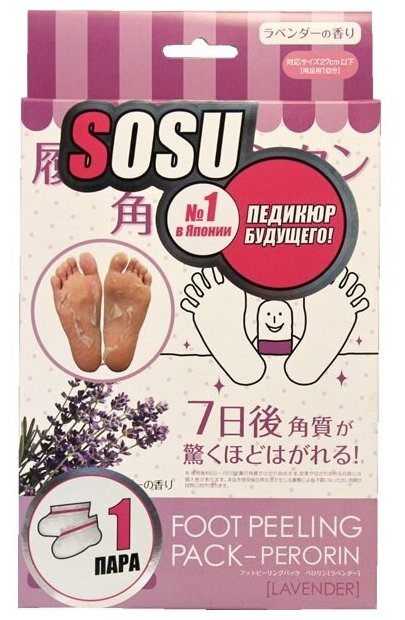 Носочки Sosu — это инновационный способ педикюра на дому без риска и траты времени на посещение дорогостоящих процедур. Sosu — новое слово в косметологии, разработанное японскими специалистами, которое уже по достоинству оценили женщины страны восходящего солнца, вверив самой природе заботу о своих ножках. Основной компонент активного вещества — молочная кислота и растительные экстракты лопуха, лимона, плюща, жерухи, шалфея, мыльнянки и другое, стимулирующие естественный процесс отторжения мертвых тканей. Оказывают терапевтическое и эстетическое действие, быстро и безопасно решают косметологические проблемы стоп. Первый эффект заметен через 3–5 дней. Спустя две недели после применения кожа становится гладкой и упругой, сохраняя долговременный эффект. Противогрибковый эффект. Устранение трещин, потертостей и мозолей. Противоотечное и противовоспалительное действие. Улучшение эстетических качеств кожи ступни. Обладает ароматом лаванды.