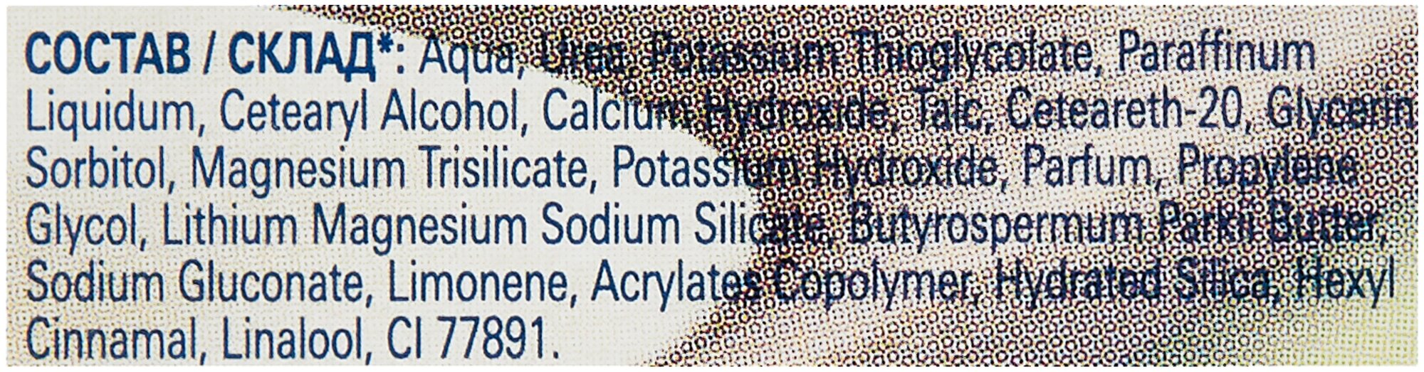 | Состав | Вода, мочевина, цетиариловый спирт, гидроокись кальция, калия тиогликолят, гидроокись кальция, цетеареф-20, ППГ-15 стеариловый эфир, полиэтилен, калия гидроксид, вазелиновое масло, трисиликат магния, пропилен гликоль, масло масляного дерева, миндаль сладкий, глюконат натрия, ВНТ, акрилатный сополимер, кремния диоксид, парфюмерная композиция, красители, CI 77891, CI77289 |