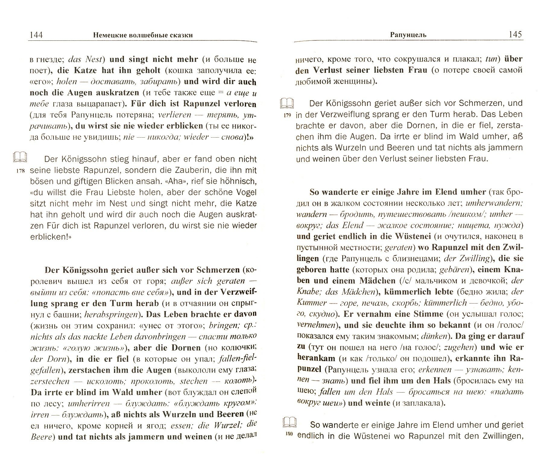 Хорошая книга, для начального этапа изучения немецкого сказки самое то. Все предложения переведены вплоть до некоторых отдельных слов. Можно встретить устаревшие слова, что, несомненно, интересно, потому что помогают пополнить словарь редко встречающимися словами.