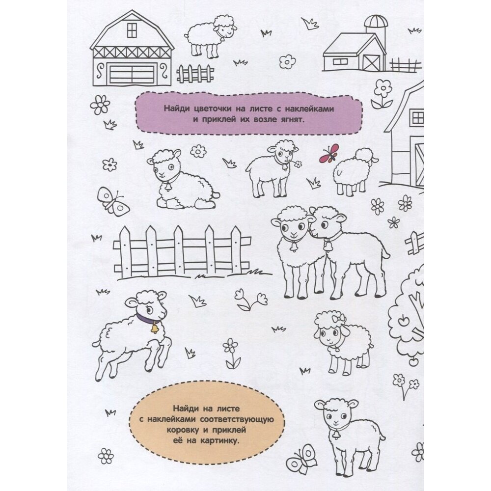 Наклеек немного. Прочные ,не рвутся. Рисунки очень симпатичные. Необходимо все раскрасить. Бумага плотная, можно раскрашивать даже фломастерами. Ребенку понравилась очень! Тема по разворотам:овощи, птицы,овцы,фрукты и ягоды, водоплавающие птицы,лошади,свиньи и все понемногу,подсолнухи, сыр и булки