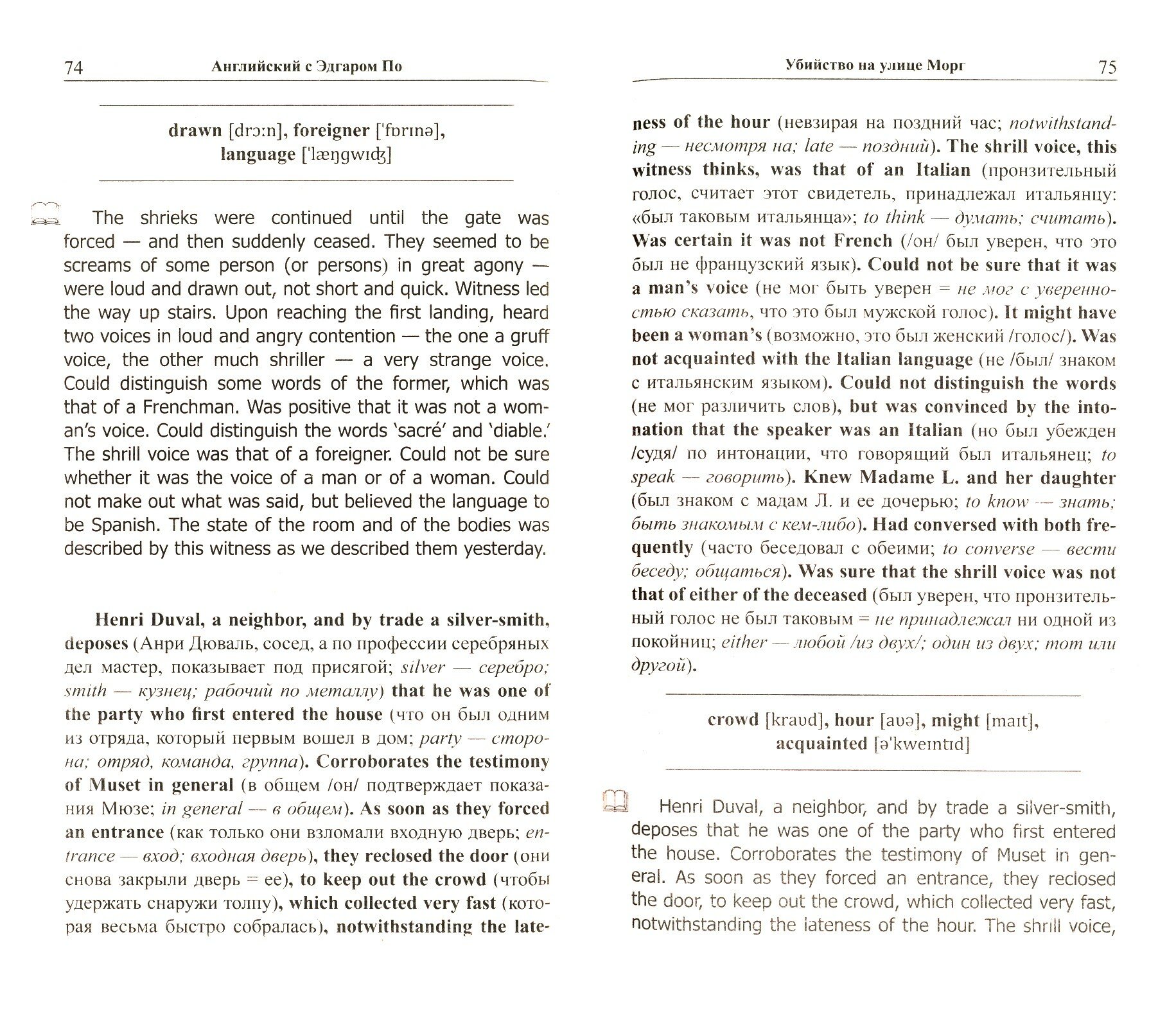 Раньше выпускалась эта книга вместе с другим рассказом Э. По "Похищенное письмо", жаль, что решили сократить объем. По началу мне казалось, что язык в книге трудноват (когда речь шла о дедуктивном методе, анализе и прочем), но когда начинается само повествование, все становится куда интереснее. Главный герой этой книги является прообразом великого и всем известного Шерлока Холмса. Забавно, что в отзывах нельзя писать спойлеры, но при этом спойлер уже заключен в оформление обложки этой книги - довольно странное решение издателя. Что касается самого метода изучения языка - на мой взгляд, он эффективен только когда вы не совсем начинающий, а уже знаете основы грамматики языка и хотя бы тысячу основных слов - тогда любая книга серии будет для вас наиболее полезна. Чем больше основных слов вы уже знаете, тем больше новых слов сможете для себя открыть при чтении.
