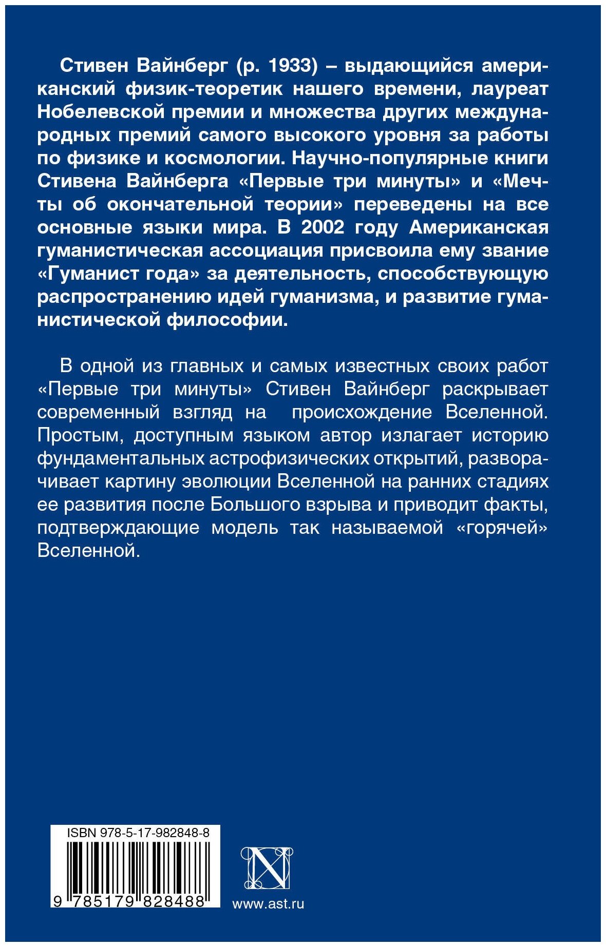 В одной из главных и самых известных своих работ "Первые три минуты" Стивен Вайнберг раскрывает современный взгляд на происхождение Вселенной. Простым, доступным языком автор излагает историю фундаментальных астрофизических открытий, разворачивает картину эволюции Вселенной на ранних стадиях ее развития после Большого взрыва и приводит факты, подтверждающие модель так называемой "горячей" Вселенной.