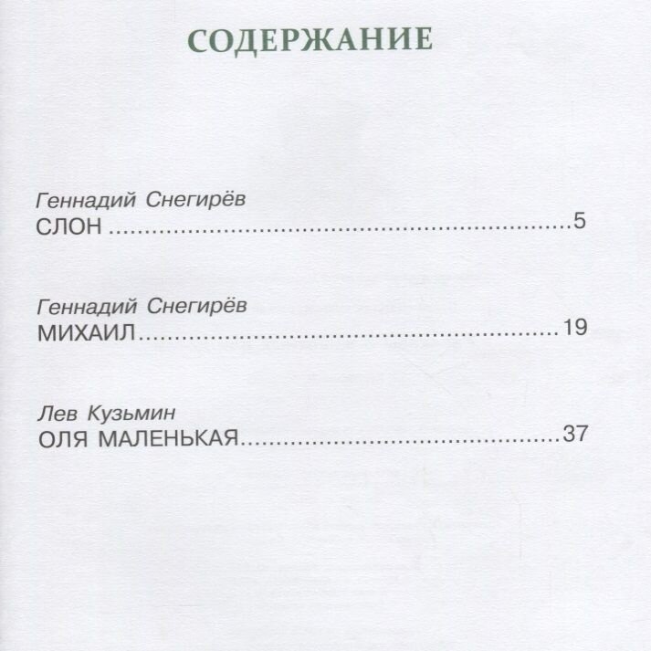 В сборник "Рассказы о животных для детей" вошли произведения Геннадия Снегирева "Слон", "Михаил" и Льва Кузьмина "Оля маленькая".
