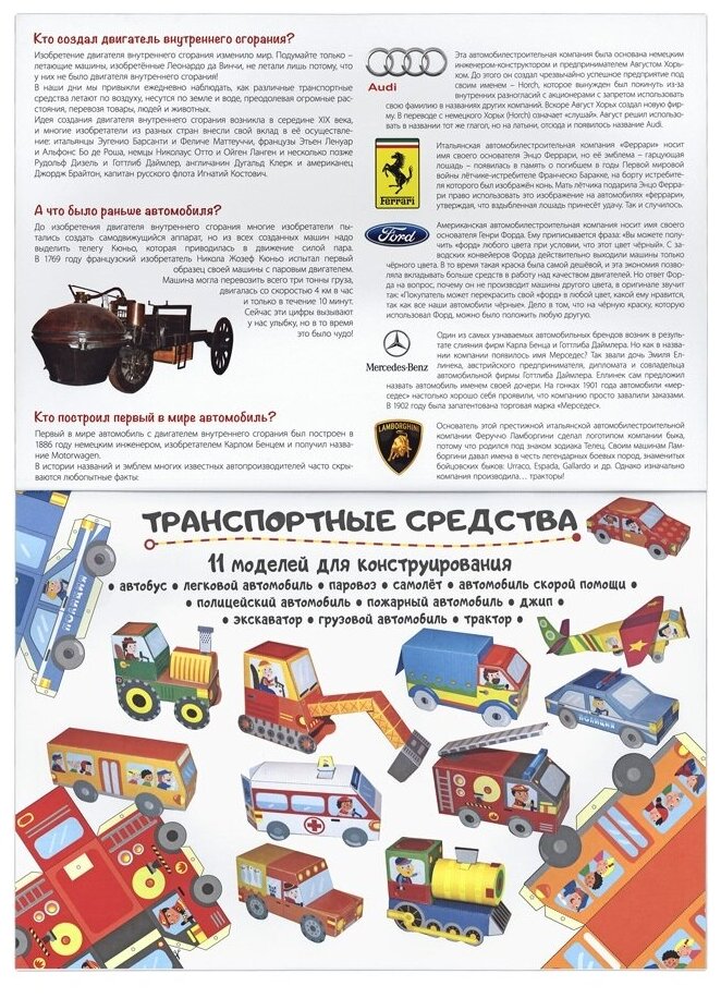 Купила юному любителю техники, предвкушаю, как ему будет интересно вырезать и собрать машинку самому. Пока сыну 3,5 и хотя он знаком с ножницами, пока эти его умения очень зачаточные, думаю, с журналом интереснее будет поработать лет в 5. Сына журнал очень впечатлил, на форзаце он увидел несколько эмблем машин - тут вообще восторг. Есть что и почитать, и много моделей, журнал большого формата