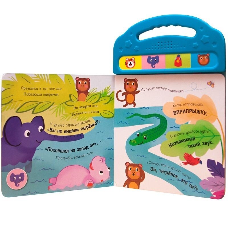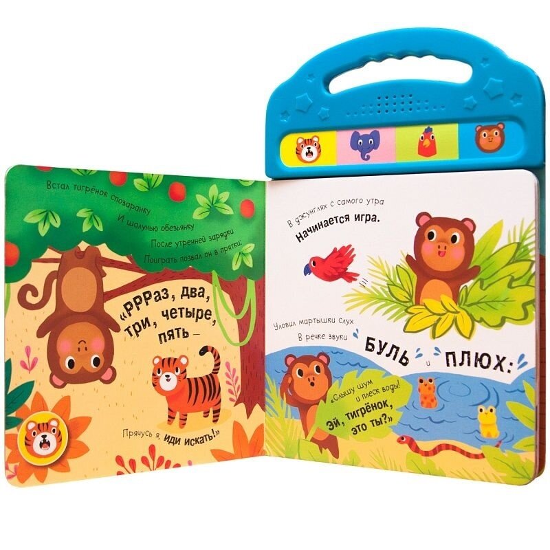 Р-р-р! Отправляйтесь в джунгли и поиграйте в веселые прятки вместе с тигренком, обезьянкой, слоном и попугаем. Нажимайте на кнопки и слушайте звуки джунглей!