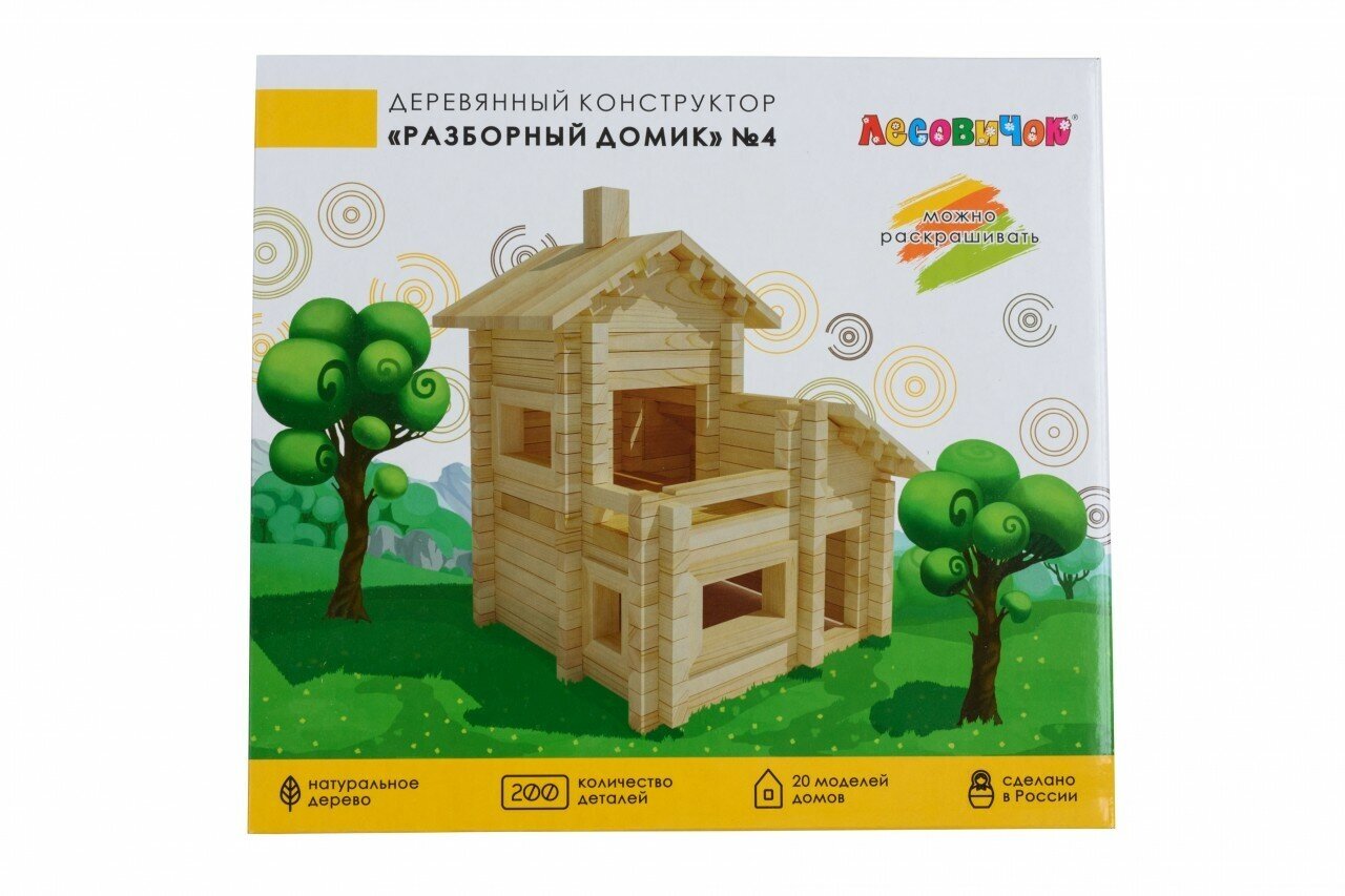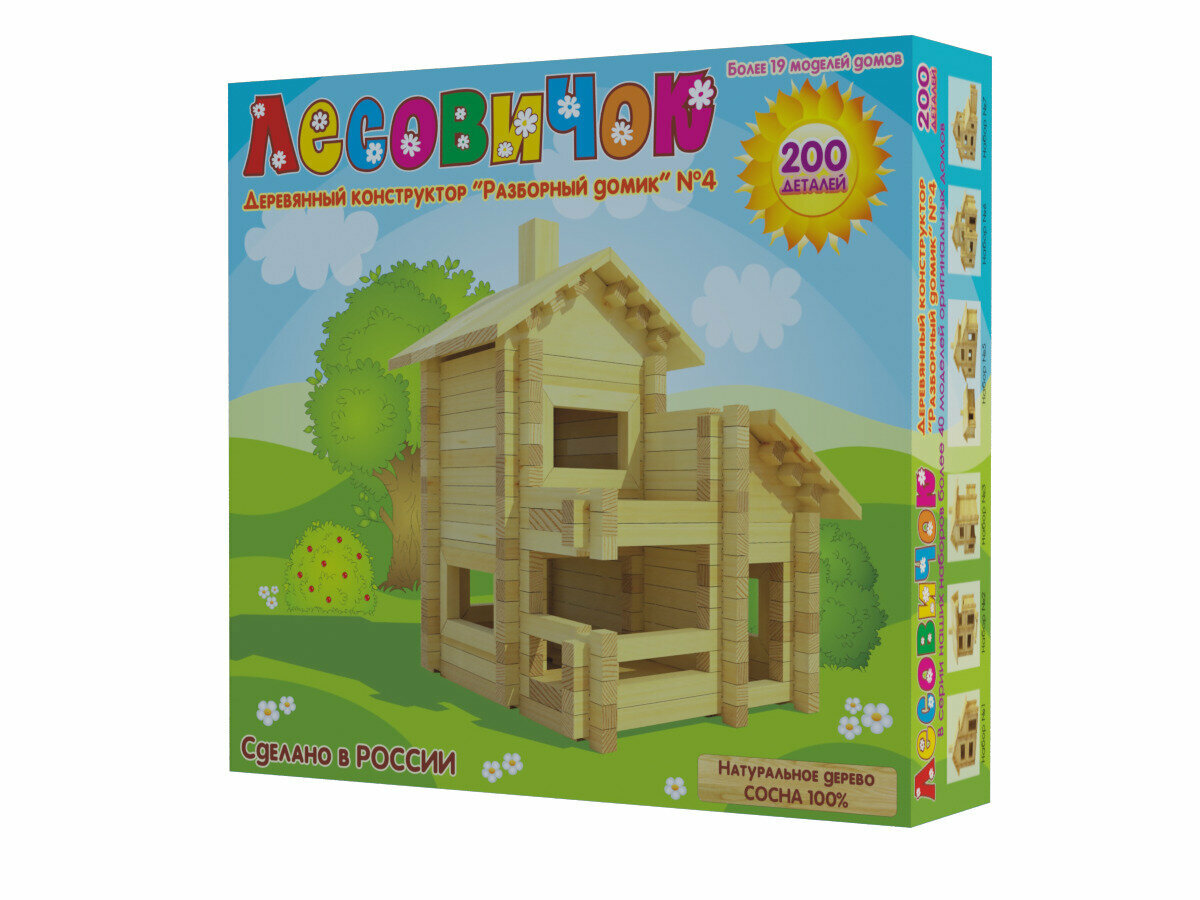 Конструктор Лесовичок Разборный домик №4 состоит из 200 деталей, при помощи которых ваш ребенок сможет построить миниатюрное здание домика. К набору прилагается подробная инструкция по сборке. Детали конструктора легко скрепляются между собой, что позволяет юному строителю без труда собрать деревянную поделку.