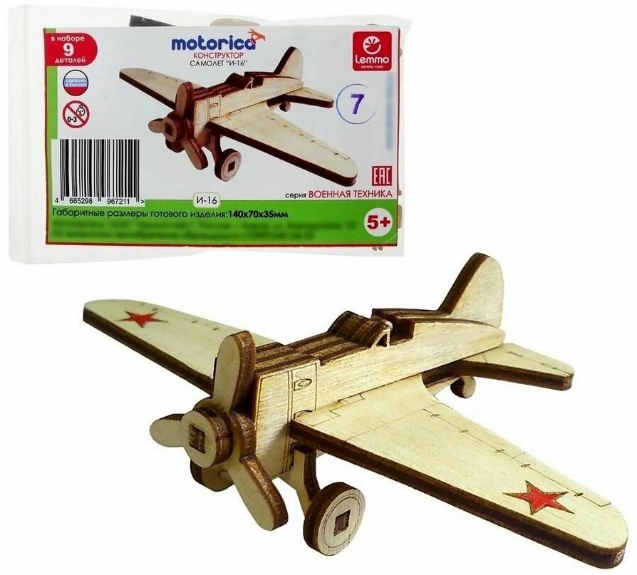 Экологически чистые, развивающие конструкторы от российского производителя Lemmo помогут вашему ребенку развить мелкую моторику рук, воображение, пространственное мышление, логику и предметное моделирование. Все детали выполнены из качественной древесины и имеют сильный насыщенный запах дерева. Наборы укомплектованы клеем ПВА и наждачной бумагой. Любой конструктор после сборки можно раскрасить акриловыми и гуашевыми красками, но даже без этого в результате получается полноценная красивая игрушка с подвижными элементами. Набор Советский истребитель И-16 один из самых маленьких конструкторов у Леммо, он собирается без клея. У собранной модели вращается винт. Рекомендуется для детей от 5 лет. Кол-во деталей: 9 шт. Размеры: 140х70х35 мм Что в наборе: наждачная бумага, подробная инструкция,