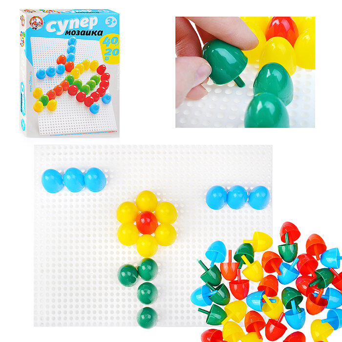 Пластмассовая мозаика — отличная развивающая игрушка для детей от трех лет. Детям помладше ее предлагать не стоит, из-за наличия мелких деталей. Мозаика собирается на игровом поле, в отверстия которого вставляются небольшого размера разноцветные фишки. Подбирая фишки по цвету и располагая в разной последовательности, можно создавать на поле целые картины. Собирание мозаики заинтересует каждого ребенка, можно подобрать вариант игры на любой вкус. Ваш ребенок сможет научиться собирать целую картинку из маленьких частей, составлять изображения от простых к сложным. В процессе игры дети приучаются к осмысленной деятельности, учатся ставить перед собой практические цели и добиваться результата. Работа с маленькими фишками развивает мелкие моторные движения рук, следовательно, стимулирует развитие речи и интеллекта ребенка. Цветная детская мозаика также поможет развить фантазию и художественный вкус, это прекрасная возможность для малыша проявить свою творческую активность. Яркая красочная мозаика для детей войдет в число любимых игрушек Вашего ребенка, главное — помочь малышу на первых порах и показать, как из бесформенной горки фишек можно создать настоящую картину.
