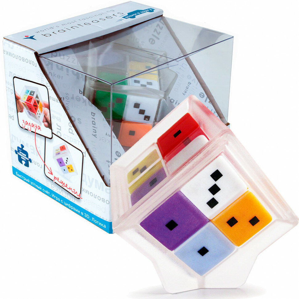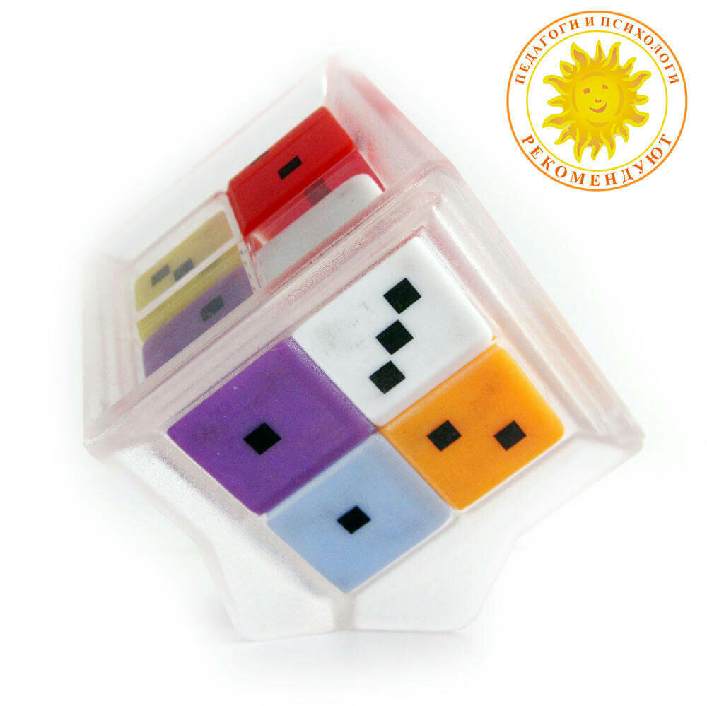 Математическая головоломка на устный счет с большим количеством игровых заданий различной сложности. Может использоватья в образовательных целях как учебное пособие для устного счета, изучения состава числа, выявления неординарных способностей. Автор - известный российский изобретатель головоломок Владимир Иванович Красноухов. В основе игрушки 7 игральных кубиков разных цветов с точками от 0 до 5 (а не 1-6, как на обычных игральных кубиках!), которые перемещаются внутри прозрачного корпуса головоломки в форме большого куба, образуя комбинации цифр на гранях этого куба. И хотя все кубики цветные, тут не требуется сборка по цветам. На первый взгляд, комбинации абсолютно случайны, но у игрушки есть свои секреты. Например, сумма точек всех 4 кубиков на противоположных гранях куба всегда одинакова, так что игроку не нужно проверять значения всех 6 сторон головоломки - зная значения на 3 смежных гранях, легко вычислить всю сумму цифр на Семерке.