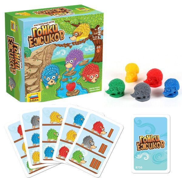 | Состав набора | игровое поле,4 кубика D6 с разноцветными гранями,5 разноцветных фигурок ежиков,60 карточек,правила |