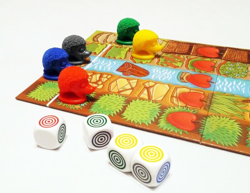| Комплектация | игровое поле, 4 шестигранных кубика с цветными сторонами, 5 фишек ёжиков, 60 карточки, правила игры |