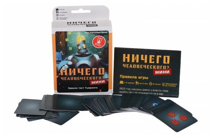 2025 год, машины давно у власти. Пора пройти тест, не скрывается ли в вас что-то человечное... Исключительная память это лучшее доказательство, что по вашим синтетическим венам течёт машинное масло. «Ничего человеческого?» — это быстрая и весёлая игра на развитие памяти. Инновационные правила выводят знакомые с детства «игры на память» на другой уровень, позволяя игрокам взвешивать свой риск и активно взаимодействовать с друг другом.