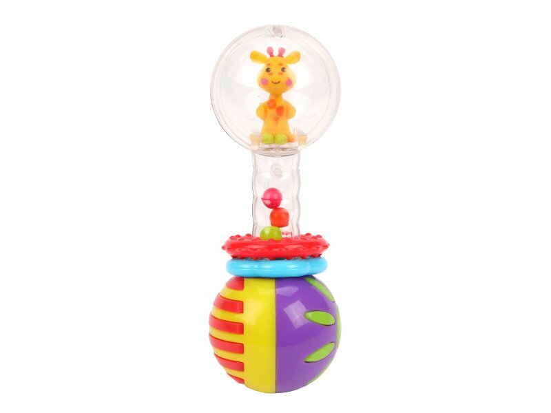 Погремушка в виде гантельки обязательно понравится малышу. Внутри прозрачной ручки погремушки — разноцветные шарики, которые будут весело греметь, если потрясти погремушкой в воздухе. Яркие фактурные колечки свободно перемещаются по ручке снаружи и тоже гремят. Внутри прозрачной колбы на одном конце гантельки — забавный жирафик.