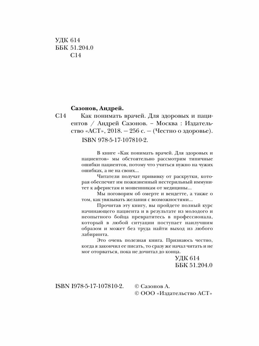 Прочитала книгу Андрея Сазонова "Как понимать врачей", и нахожу её весьма полезной для людей, часто обращающихся в различные медицинские учреждения. Лично меня удивила информация о том, что при выборе врача не следует уделять большого внимания наличию у него ученой степени, которая говорит только о том, что человек углубленно изучил определённую узкую тему и защитил по ней диссертацию. Совершенно не обязательно темой его научных изысканий является именно та проблема, с которой обратился пациент. Гораздо важнее категория врача - она говорит об опыте его работы конкретно в данной области. Книга содержит много подобной практической информации.