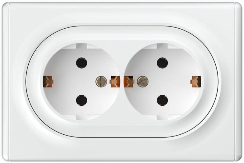Розетка относится к категории встраиваемых: изделие крепится к подрозетнику в стене. Заземляющий контакт сделан в виде скобы (разъём Schuko). Основной материал — износостойкий поликарбонат. Розетку можно использовать в сухих закрытых помещениях: степень пыле- и влагозащиты корпуса IP20.