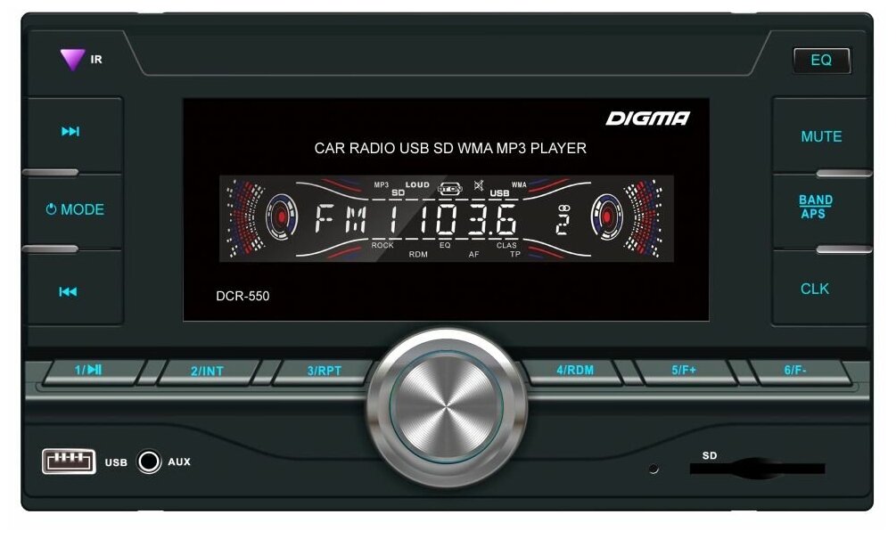 К основным особенностям модели Digma можно отнести наличие информативного ЖК-дисплея, возможность чтения карт памяти microSD, подсветку функциональных клавиш, а также разъем USB и вход AUX 3.5 мм на фронтальной панели. Также имеется функция автопоиска радиостанций в популярном диапазоне FM и цифровой энкодер для регулировки громкости.