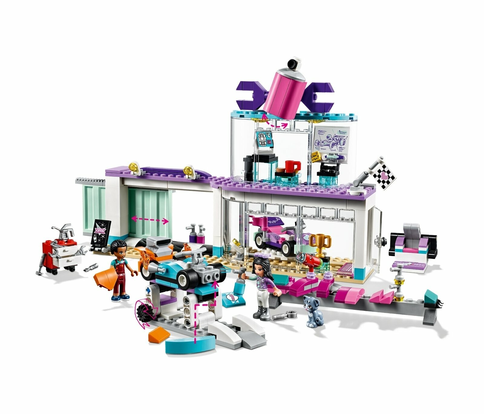 Эмма и ее друг Дин открыли небольшую автомастерскую «Lego Friends Мастерская по тюнингу автомобилей 41351», где готовят свои и чужие авто к соревнованиям. Тут можно неплохо улучшить характеристики машины, ведь Эмма и Дин – умелые автомеханики, которые возьмутся за самую сложную работу. Крышу двухэтажной мастерской венчает вывеска – гигантский разводной ключ и баллон с автоэмалью. На верхнем этаже расположен мини-офис, на нижнем – непосредственно мастерская. Тут уже стоят два гоночных авто, готовые к ремонту. В арсенале механиков есть платформа для осмотра машин, множество инструментов, запасные детали и элементы для тюнинга внешнего вида. Представленный набор позволит вам почувствовать себя настоящим гонщиком или опытным механиком!