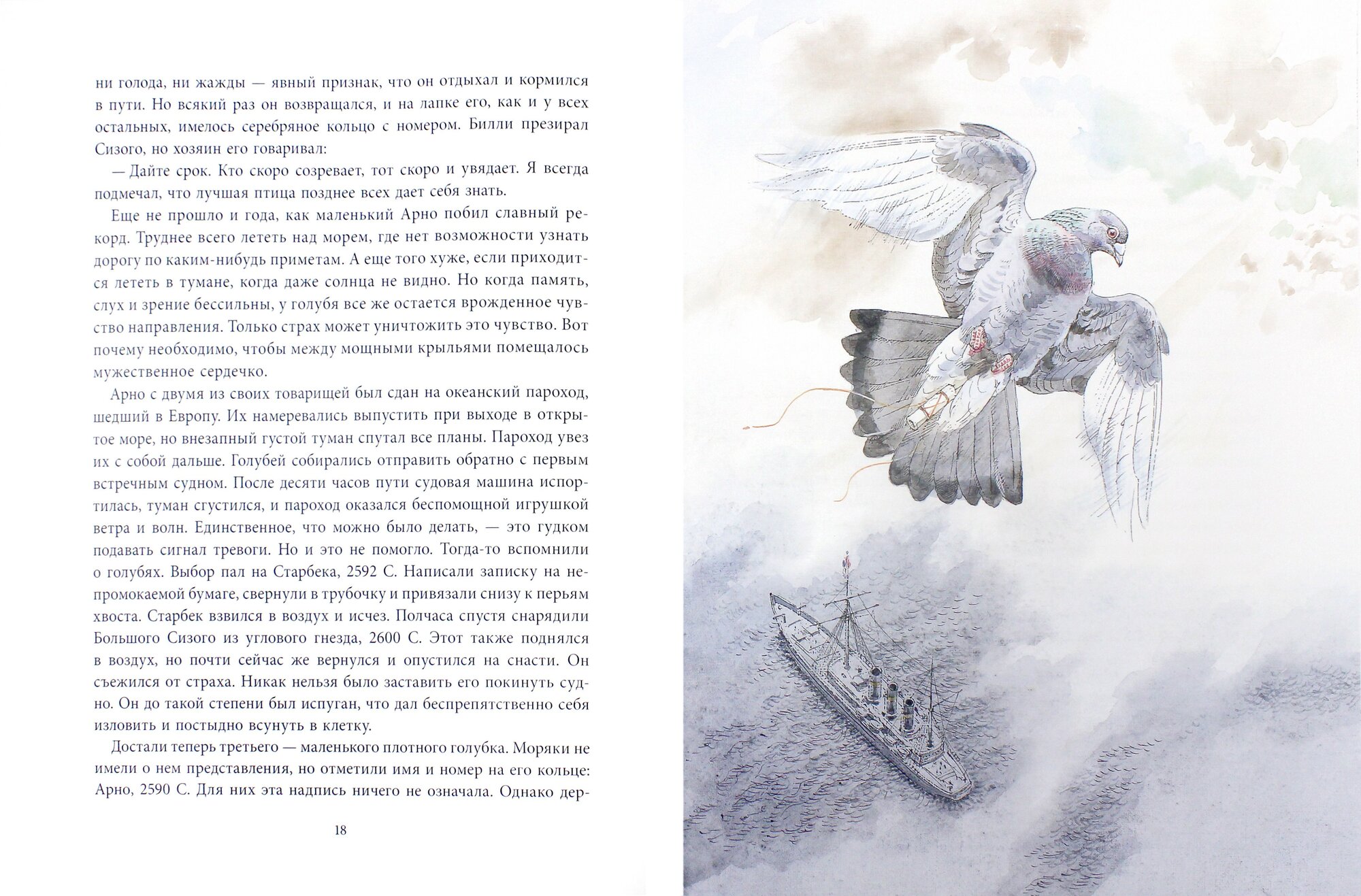 История голубя Арно показалась писателю не менее удивительной. Еще не так давно голуби состояли на почтовой и даже военной службе. Арно считался лучшим из таких голубей, он с легкостью побеждал на всех состязаниях и с блеском выдержал выпускной экзамен в специальной голубиной школе. С посланием на лапке, он безошибочно мчался к цели, и многие люди были обязаны ему своим спасением. Но однажды нашелся человек, который решил, что Арно будет служить только ему.