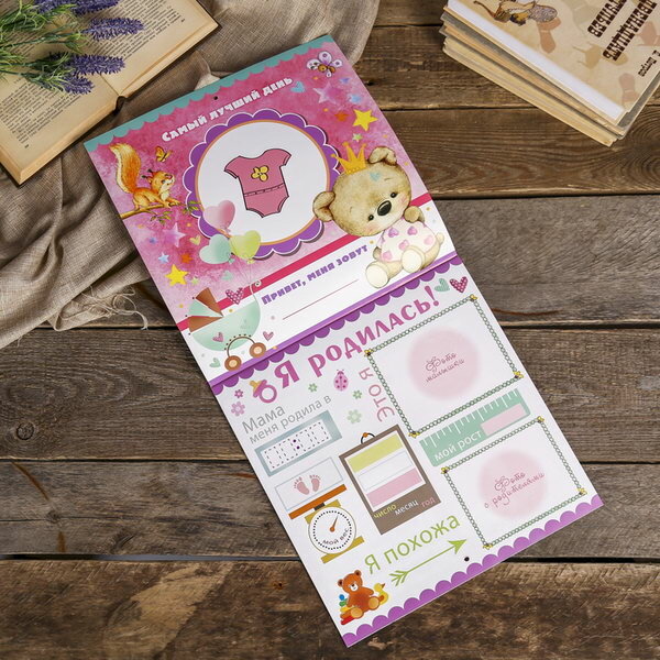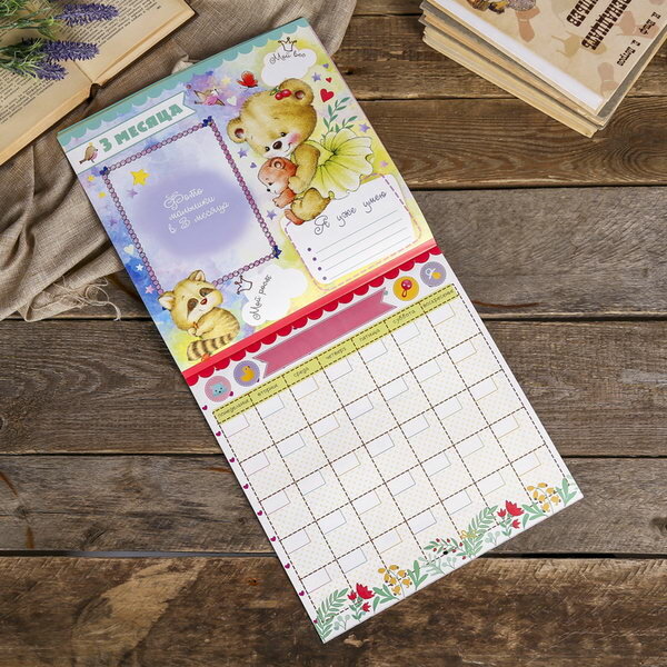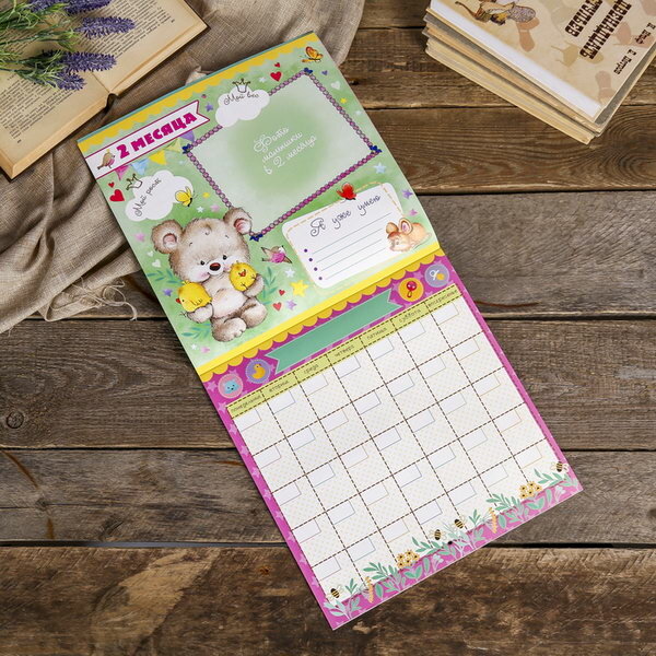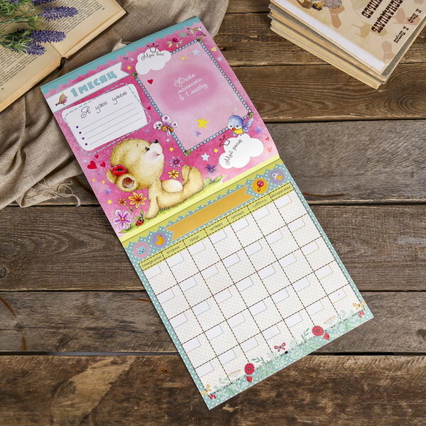 У вас родилась красавица-дочка, и теперь каждый день наполнен радостью, счастьем и новыми открытиями! Ваша крошка учится держать вас за пальчик, садиться на попку, встаёт на ножки, и вот уже по дому разносится первое "топ-топ", а самый родной голос на свете произносит первое и такое ласковое слово "мама". А ещё малышке нужно гулять, делать прививки, и ещё много-много дел, которые никак нельзя забыть! В этом удивительном календаре вы сможете отмечать все достижения вашей дочки. День за днём первый год вашей малышки будет на страничках этого календаря. Записывайте все важные даты, а самое главное, наклеивайте наклейки в клеточки! Набор самых нужных наклеек позволит не забыть вам, когда ваша принцесса первый раз улыбнулась и сказала "агу". В календарь можно вклеить фотографии1 самых важных событий первого и такого насыщенного года вашей семьи, которая теперь стала больше! Новых открытий и счастливых дней вам с вашей доченькой!