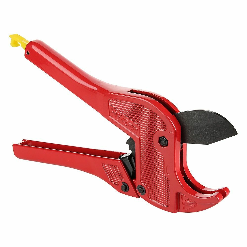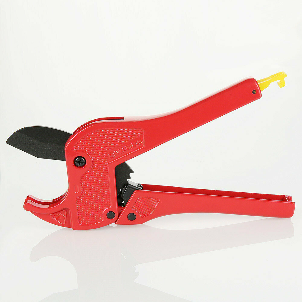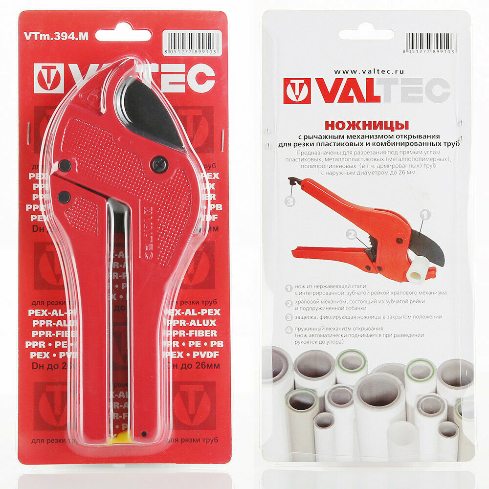 Ножницы для труб Valtec оснащены лезвием из нержавеющей стали, зубчатым храповым и рычажным открывающим механизмами, фиксирующей защелкой.