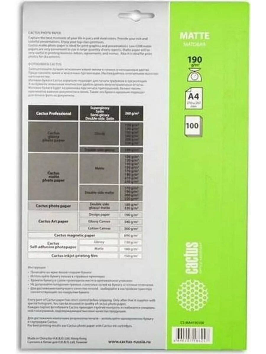Бумага Cactus CS-MA4190100 A4 подходит для использования в любых струйных принтерах с разрешением печати до 5680 dpi. Ее матовая поверхность обеспечивает приятный просмотр изображения за счет отсутствия бликов и очень точной передачи всех оттенков. Высокая плотность гарантирует быстрое впитывание и высыхание чернил, не допуская случайного смазывания полученного отпечатка.
