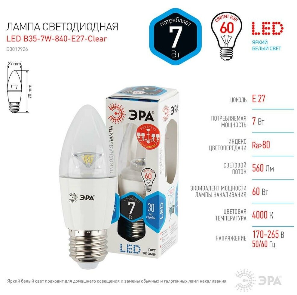- Обзор Светодиодная лампа ЭРА LED smd B35-7w-827-E27-Clear (6/60/2640)