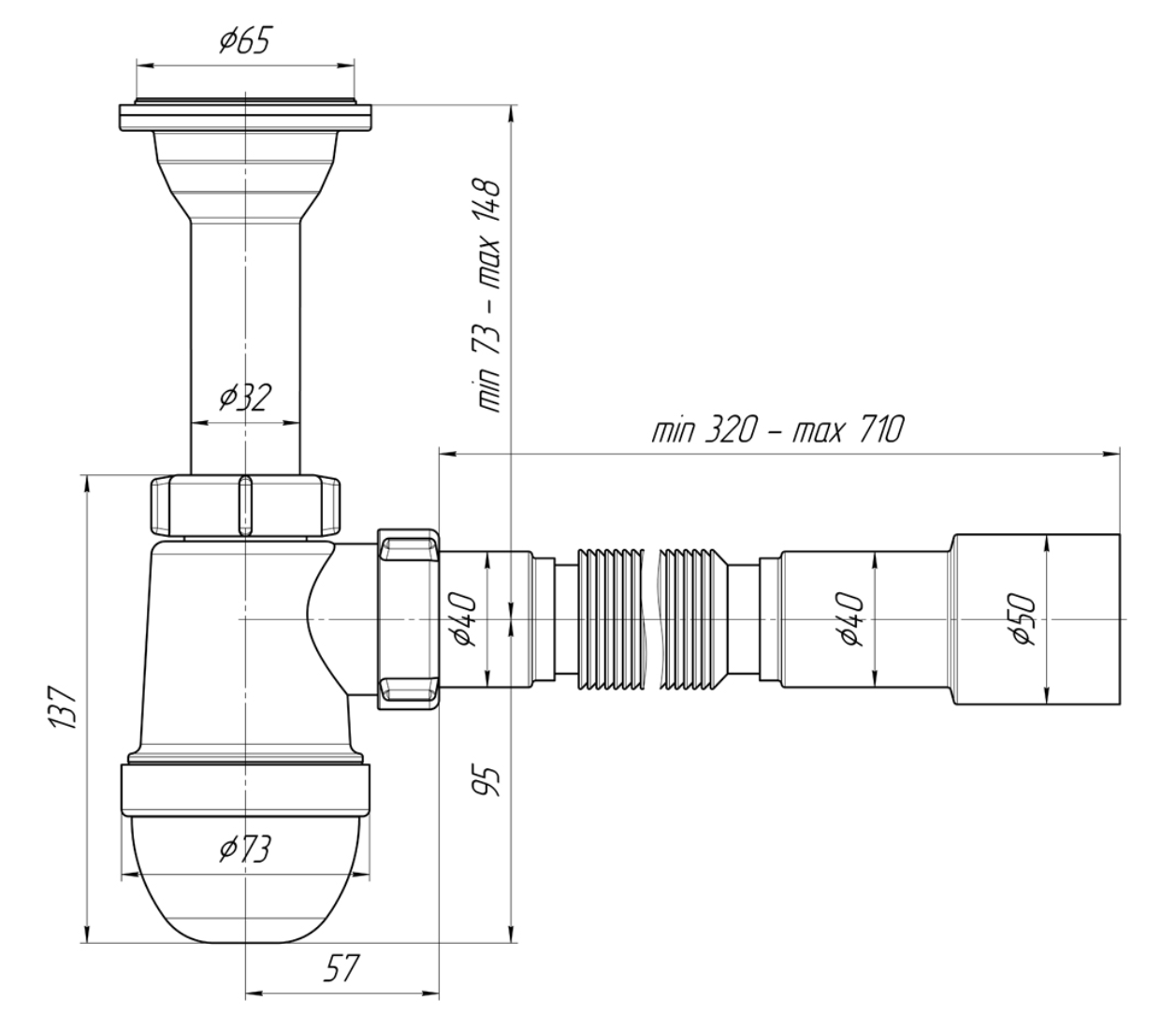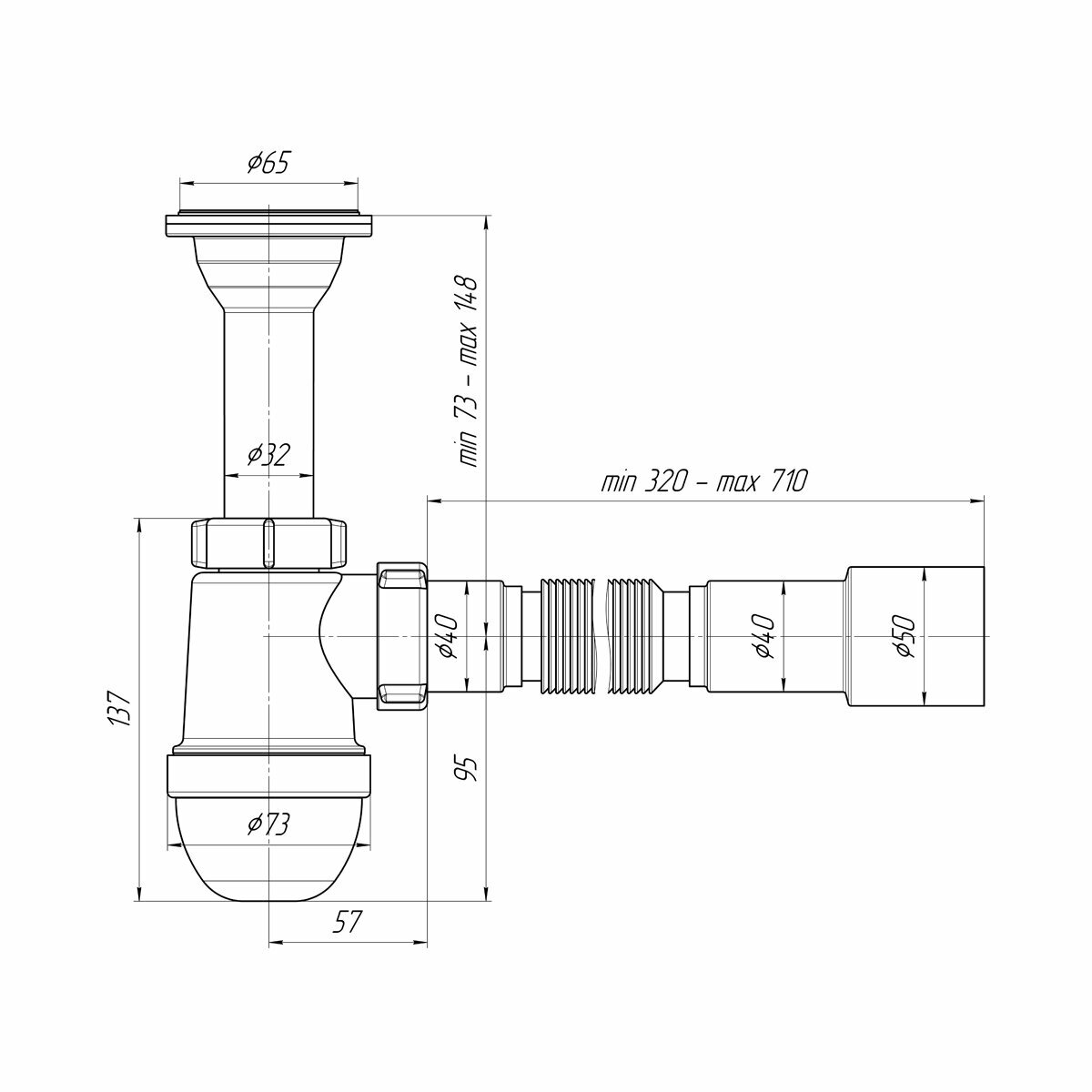 Сифон для умывальника бутылочного типа с литым выпуском и решеткой из нержавеющей стали. Для подключения к канализации комплектуется гибкой трубой 40х40/50 мм L 320-710 мм.