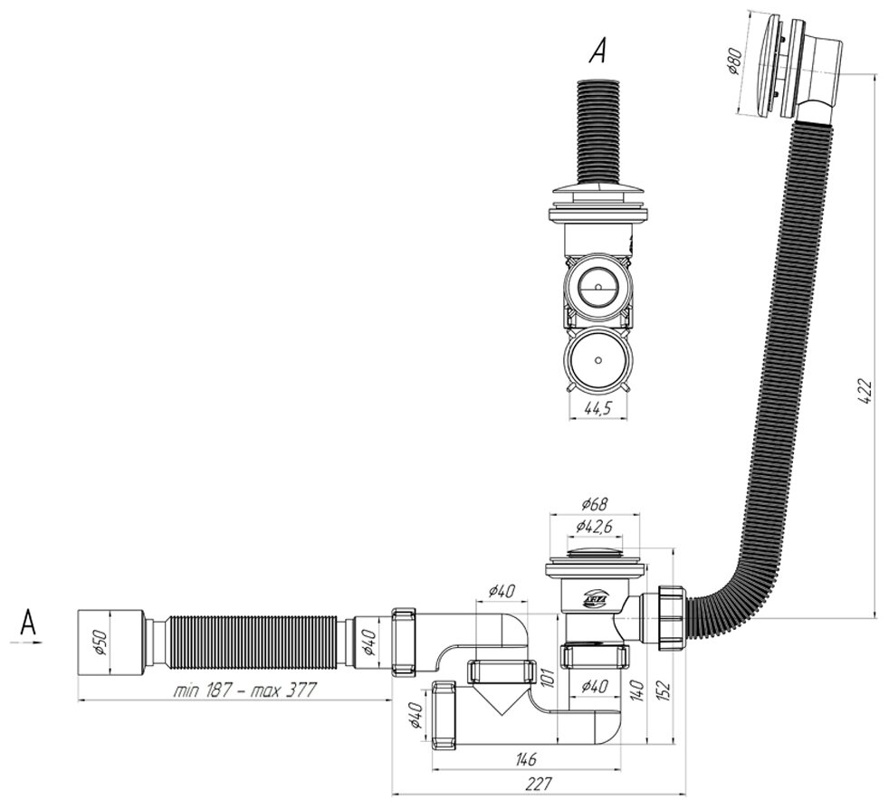 Модель: Сифон для ванны АНИ пласт клик-клак с г/тр 375х40х50 сетка