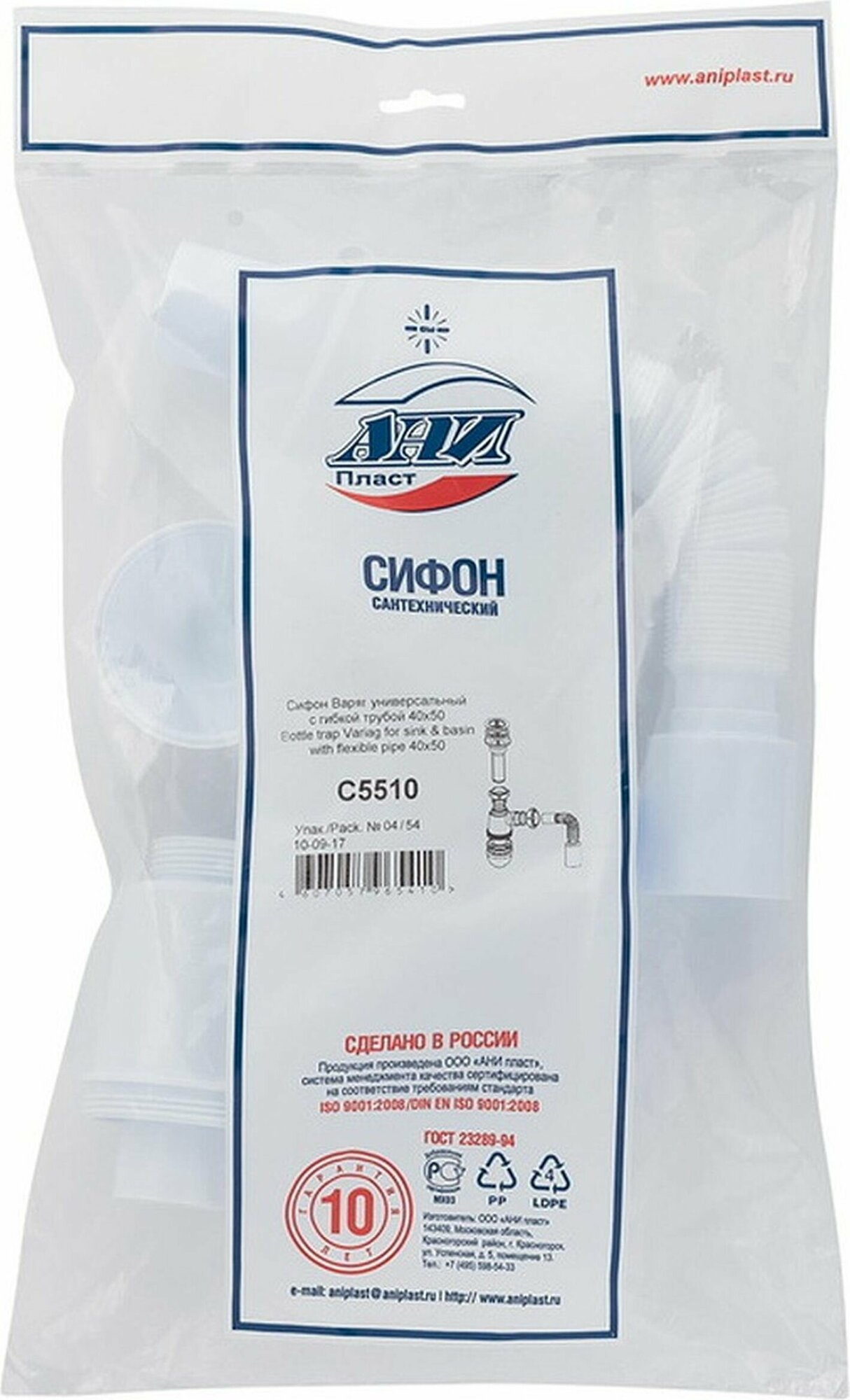 Модель: Сифон для раковины/мойки АНИ пласт 1 1/2"х40 с г/тр 40х50