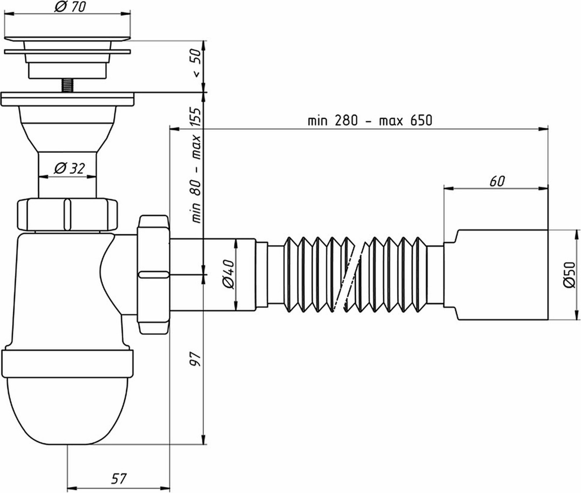 Сифон для кухонной мойки бутылочного типа. С литым выпуском и пластиковой решеткой. Для подключения к канализации комплектуется гибкой трубой 40х50 мм L 280-650 мм.