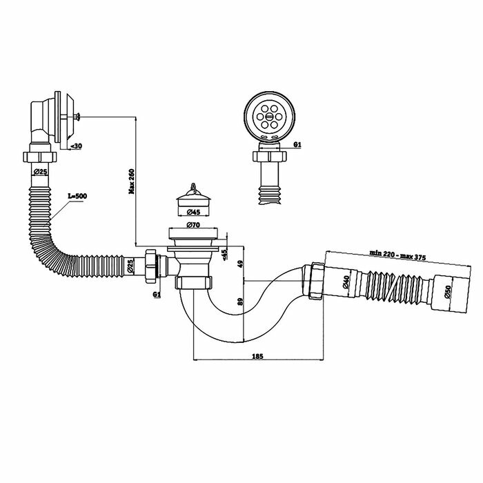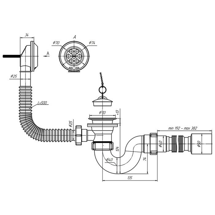 | Комплектация | Сифон с выпуском и переливом; пробка; гофротруба |